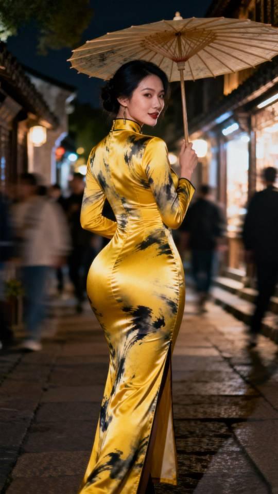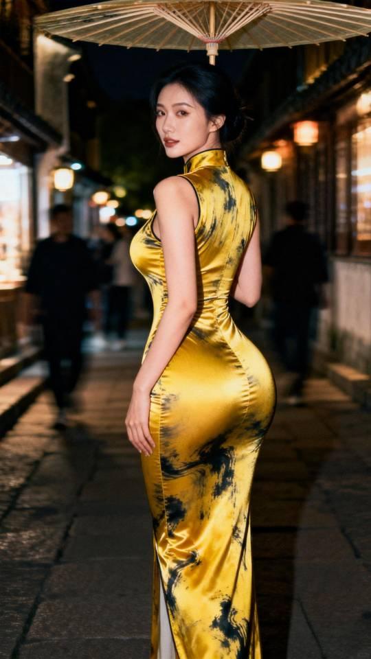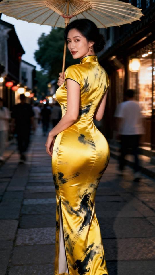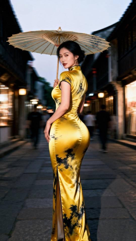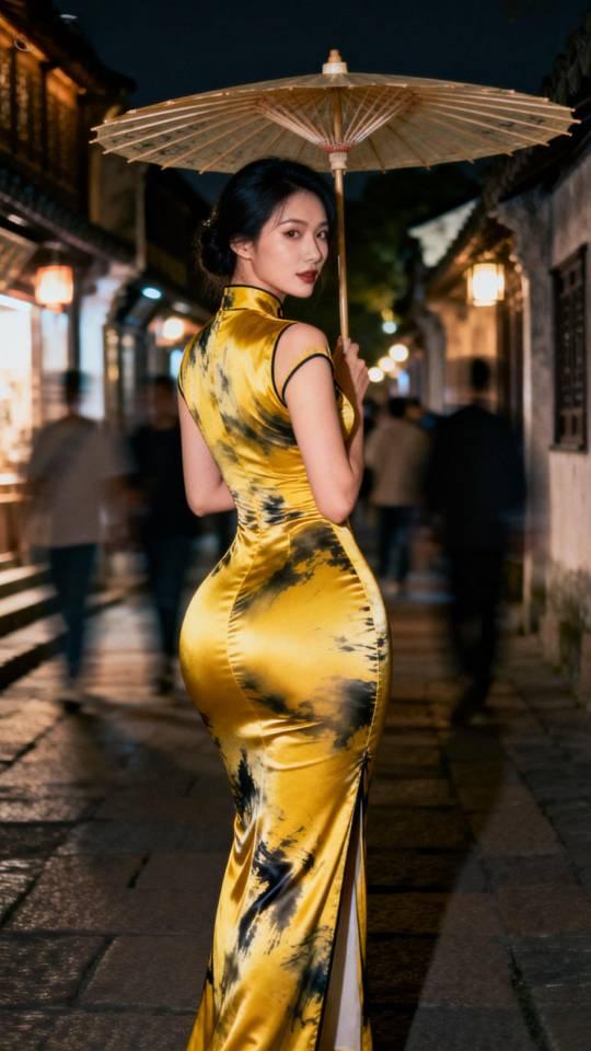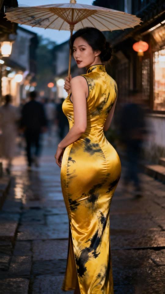身材极佳的金色旗袍美女雨中写真。旗袍秀 旗袍美人像