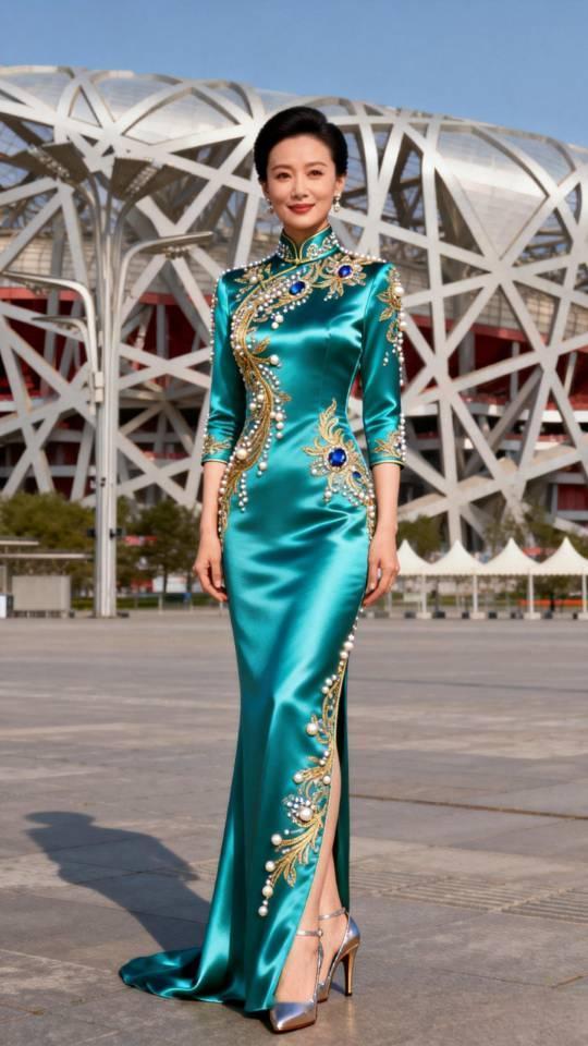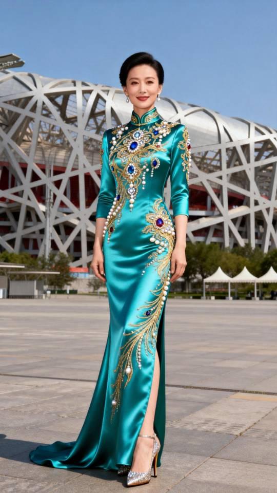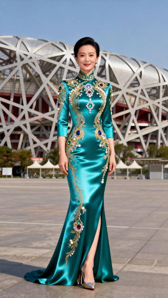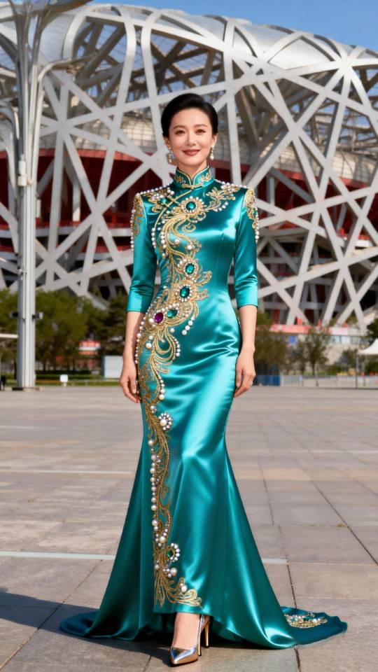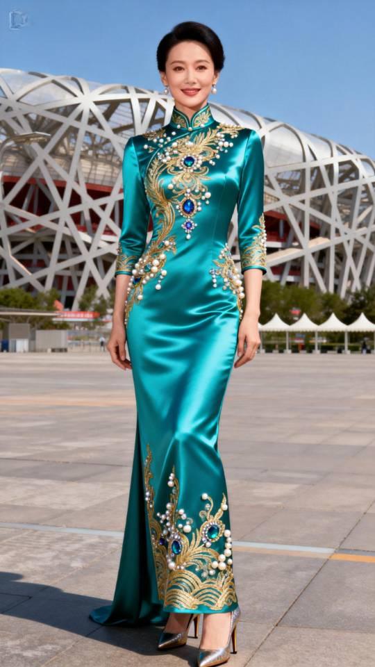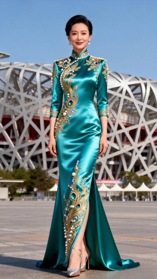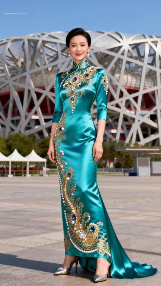 美女在鸟巢前展示大型晚会节目主持人晚礼服。晚礼服 晚礼服长裙