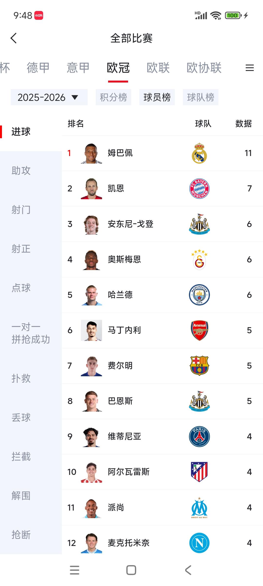 欧冠射手榜,姆巴佩独领风骚! 他打进11球,欧冠历史小组赛最多。 凯恩7球,正常表现。 哈兰德6球,一般水平。 登贝莱受伤,所以都没啥进球。 皇马要是没欧冠,姆巴佩可惜了。[可怜]