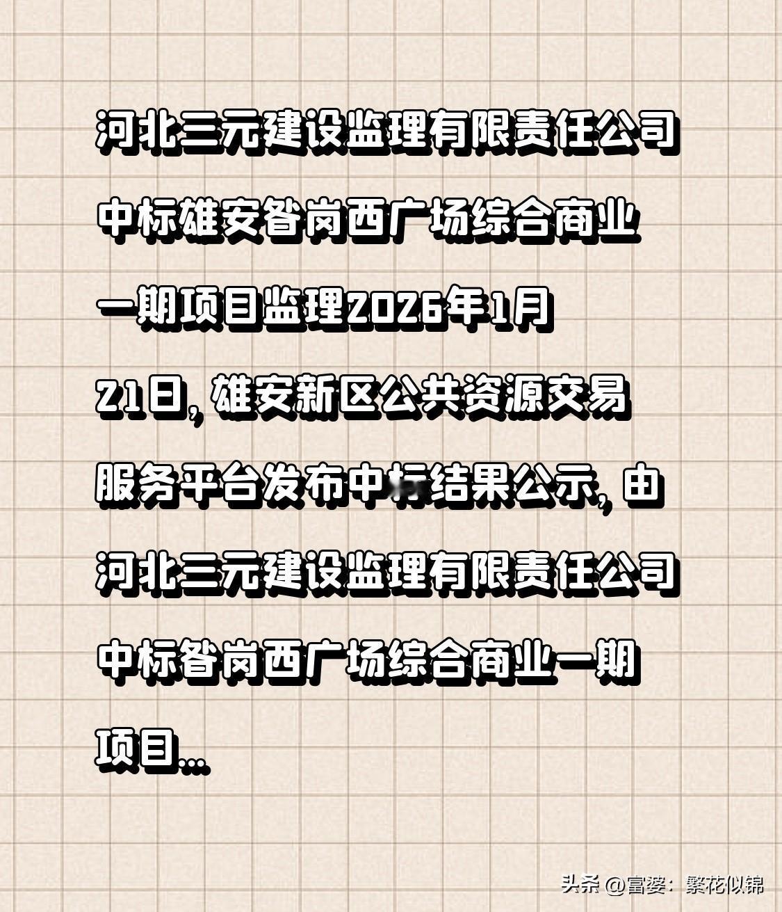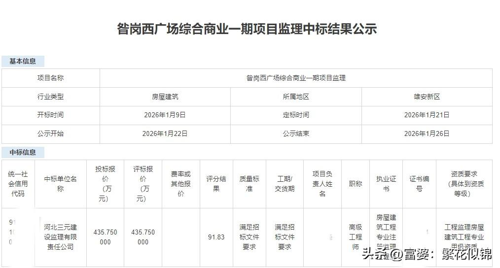 河北三元建设监理有限责任公司中标雄安昝岗西广场综合商业一期项目监理 2026年1月21日,雄安新区公共资源交易服务平台发布中标结果公示,由河北三元建设监理有限责任公司中标昝岗西广场综合商业一期项目监理,评标价为435.75万元,北京远达国际工程管理咨询有限公司及天津开发区泰达国际咨询监理有限公司投标均被否决。 根据笔者查询招标公告了解,该项目总建筑面积126255.23平方米,计划工期780天,也就是两年多的工期,计划2028年3月10日完成。对投标人的要求也不是很高,最低只需具备住建部颁发的房建专业甲级资质就可以,总监有高级职称证书。 十几万平方的商业广场,监理费400多万,在山东建筑行业是想也不敢想的,能有100万监理费都是建设单位恩赐了。 河北三元建设监理有限责任公司也是具备七个专业资质的监理公司,四个甲级,三个乙级,注册监理工程师高达60人,历史业绩多达90多项,实力强劲啊。