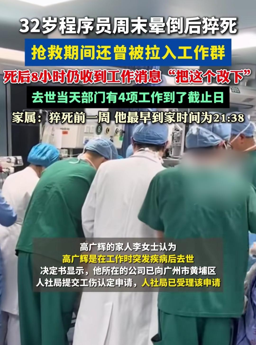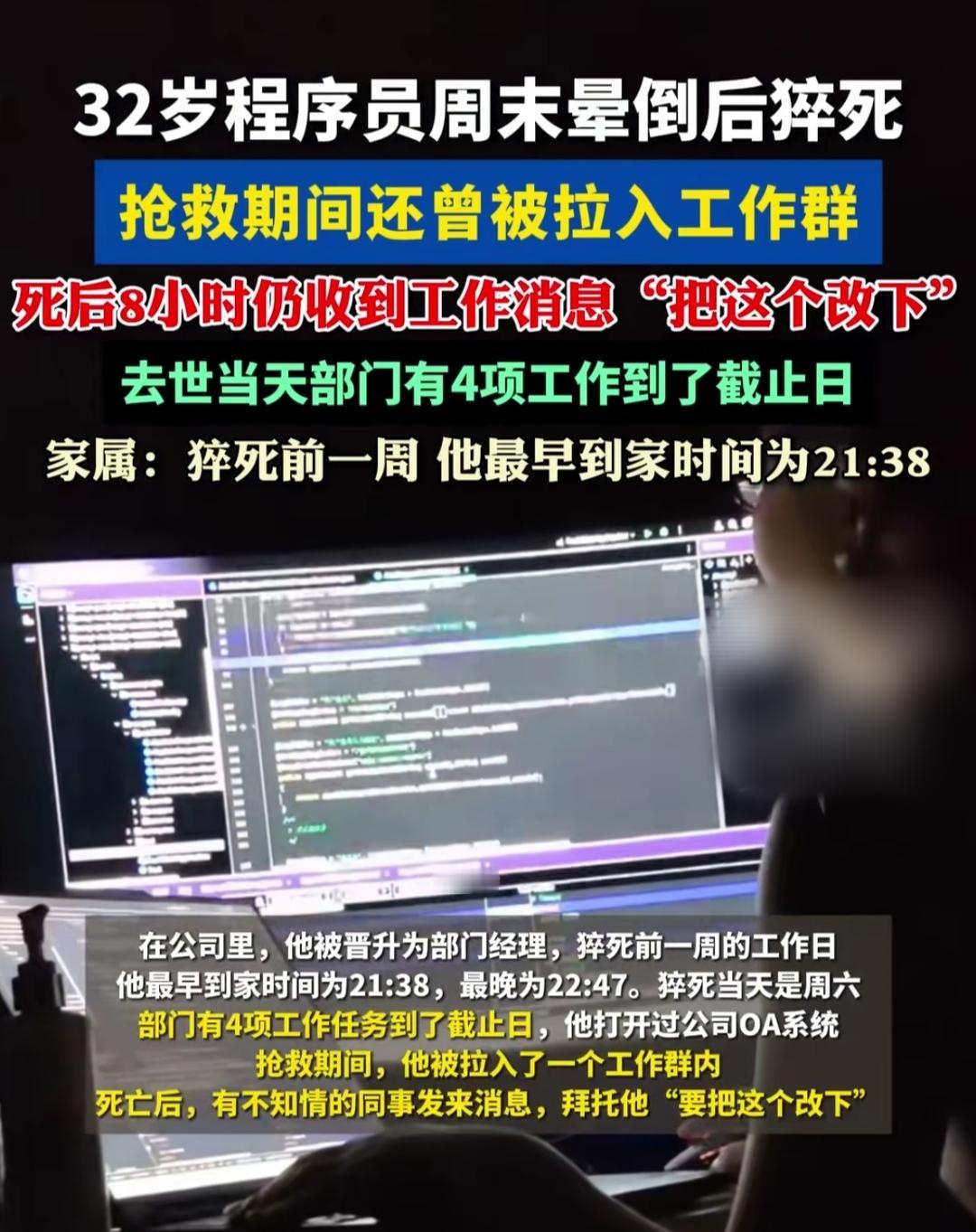 32岁正是上有老下有小的年纪,广州这位程序员周末突然晕倒,送到医院没抢救过来,就这么走了。谁能想到,他还在抢救室的时候,就被同事拉进了新的工作群,消息一条接一条。 更让人心里发堵的是,他离世8小时后,手机还收到了领导的消息:“把这个改下”。没人知道他倒下前熬了多少夜,敲了多少行代码,只看到一条鲜活的生命没了,工作消息还在催。 现在年轻人上班卷得厉害,为了赶项目熬大夜是常事,总觉得年轻扛得住。可健康这东西,真的经不起透支。到底是工作重要,还是命重要?你们身边有这种无底线加班的情况吗?