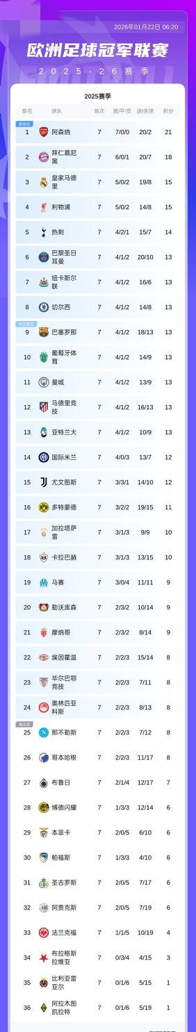 欧冠积分榜:利物浦积15分第4 切尔西积13分第8 巴萨积13分第9,曼城积13分第11 1月22日 欧冠第七轮全部结束 巴萨4-2逆转布拉格斯拉维亚 利物浦3-0马赛 纽卡3-0埃因霍温 尤文2-0本菲卡 切尔西1-0帕福斯 拜仁2-0圣吉罗斯 马竞1-1客平加拉塔萨雷 亚特兰大2-3遭毕巴逆转 最新积分榜如下:阿森纳、拜仁提前一轮晋级淘汰赛;利物浦积15分升第4,切尔西、巴萨同积13分排第8、第9名;曼城积13分第11位。法兰克福、比利亚雷亚尔、布拉格斯拉维亚、阿拉木图凯拉特四支球队 ,已提前一轮淘汰