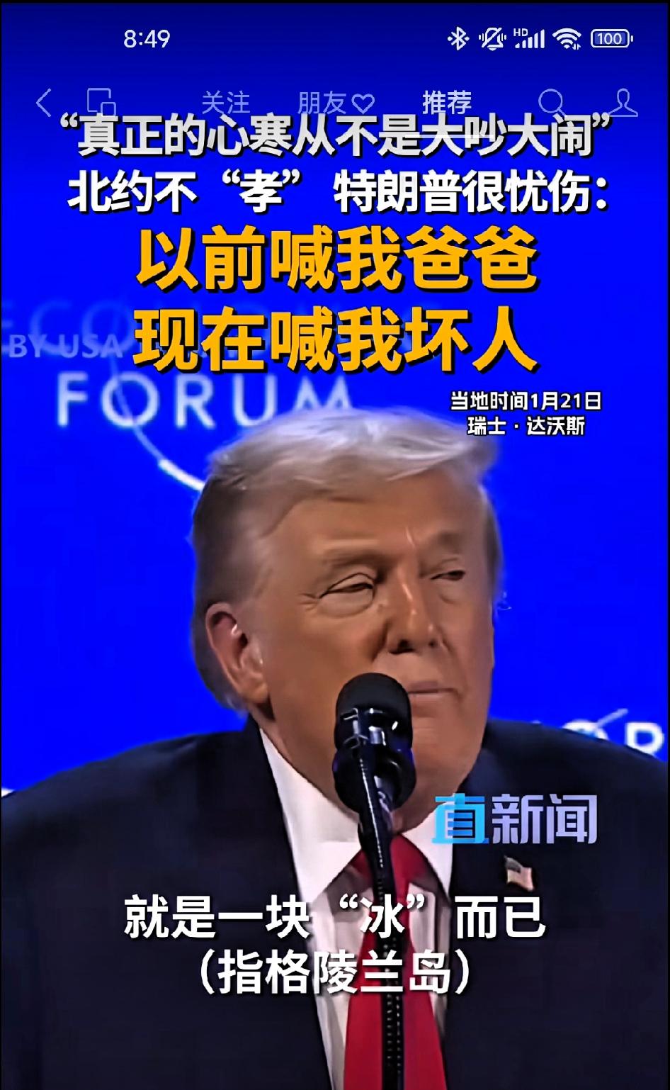 特朗普达沃斯发言:以前他们叫我爸爸,现在叫我坏人! 他们上次叫我爸爸,有个聪明的家伙说我是他们的爸爸。说我掌管着一切,但是现在我一下子变成了坏人。 现在我要的只是一块“冰”而已(指格棱兰岛),天寒地冻,穷乡僻壤的冰。与这个小小的要求相比,我给了他们什么?是几十年的付出啊! 但北约的问题在于,我们会100%的支持他们,我却不知道他们会不会支持我们。所以支持了这么多年,花了我这么多钱,流血、流汗、又流泪,不知道北约到底支不支持我们?