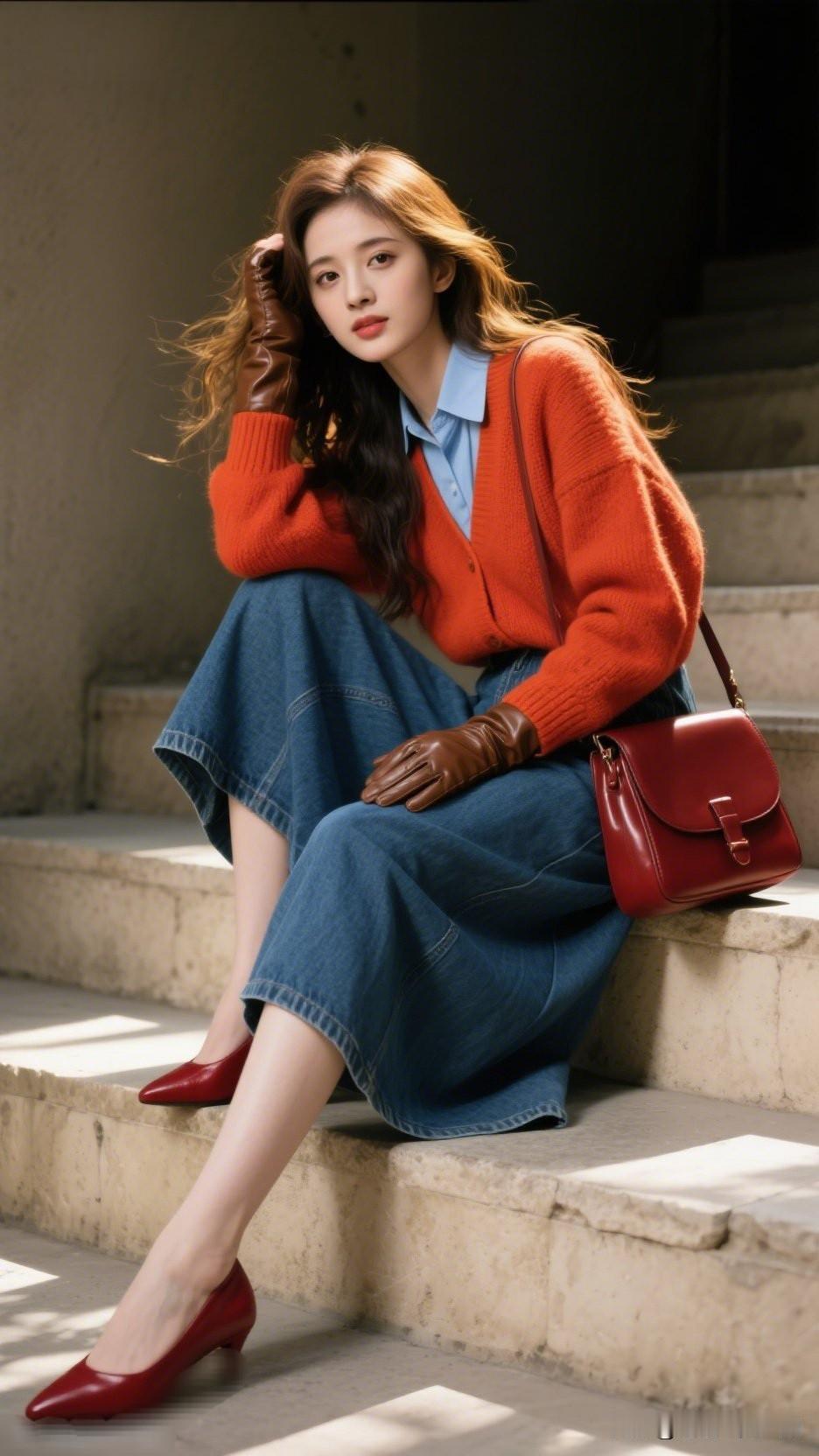 秋日穿搭指南:暖橙毛衣+牛仔裙,复古红鞋点缀,优雅动人。随手拍下生活见闻