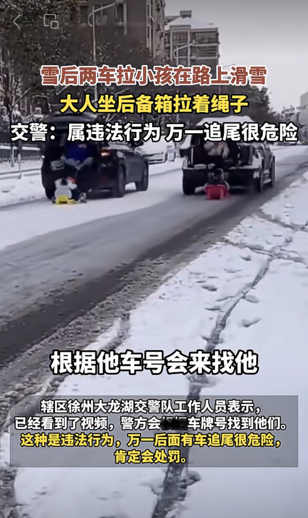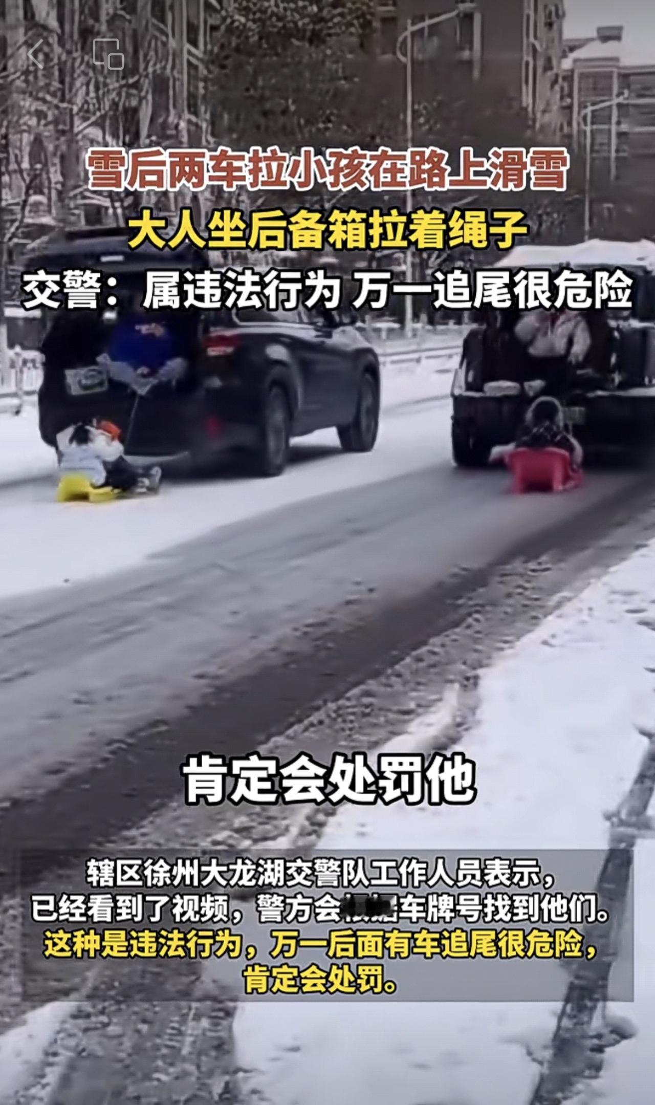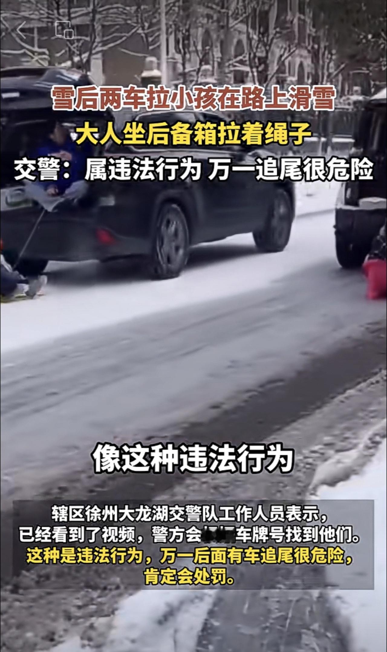 近日,江苏徐州。雪后两车拉小孩在路上滑雪,大人坐后备箱拉着绳子,警方:属违法行为,万一追尾很危险。
