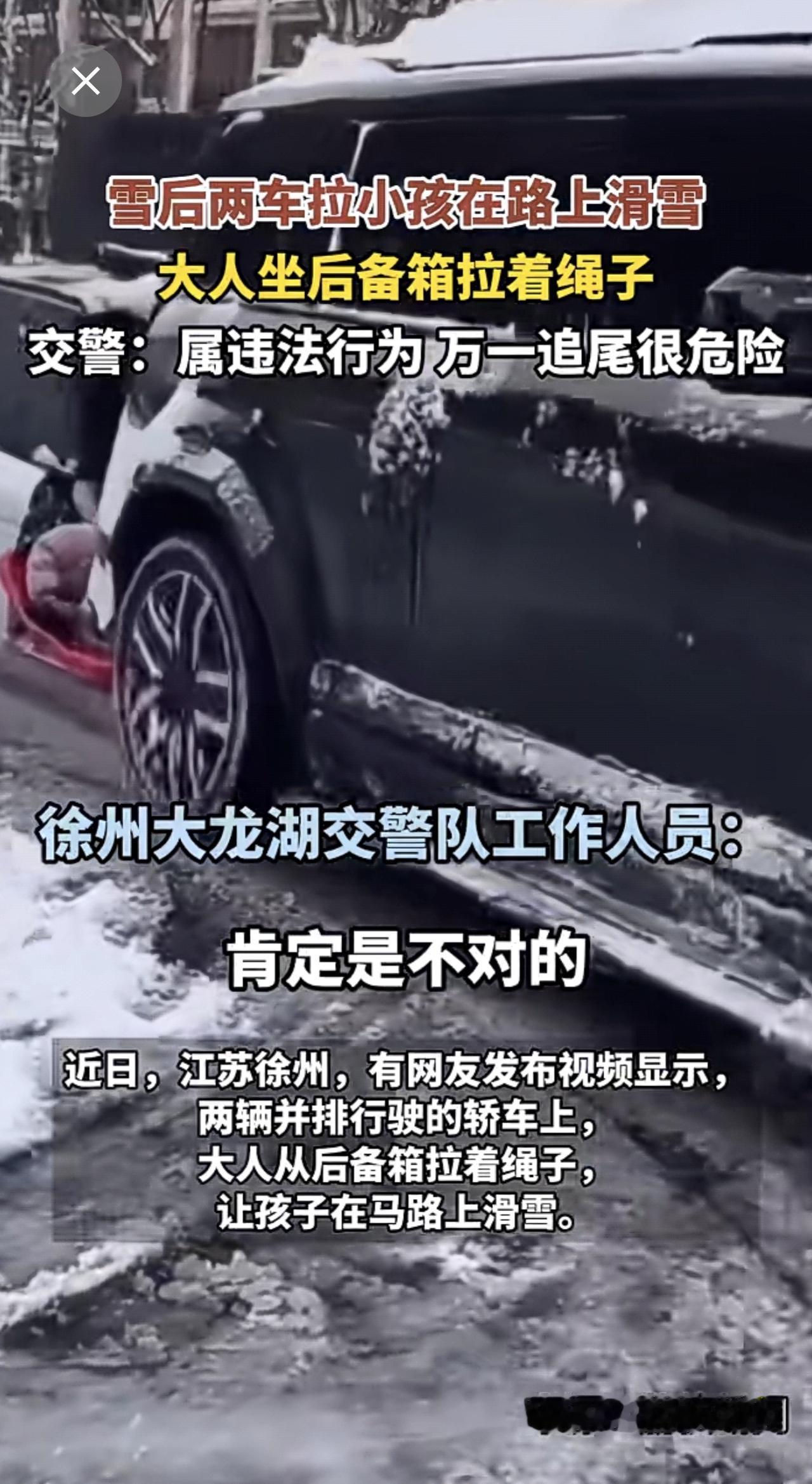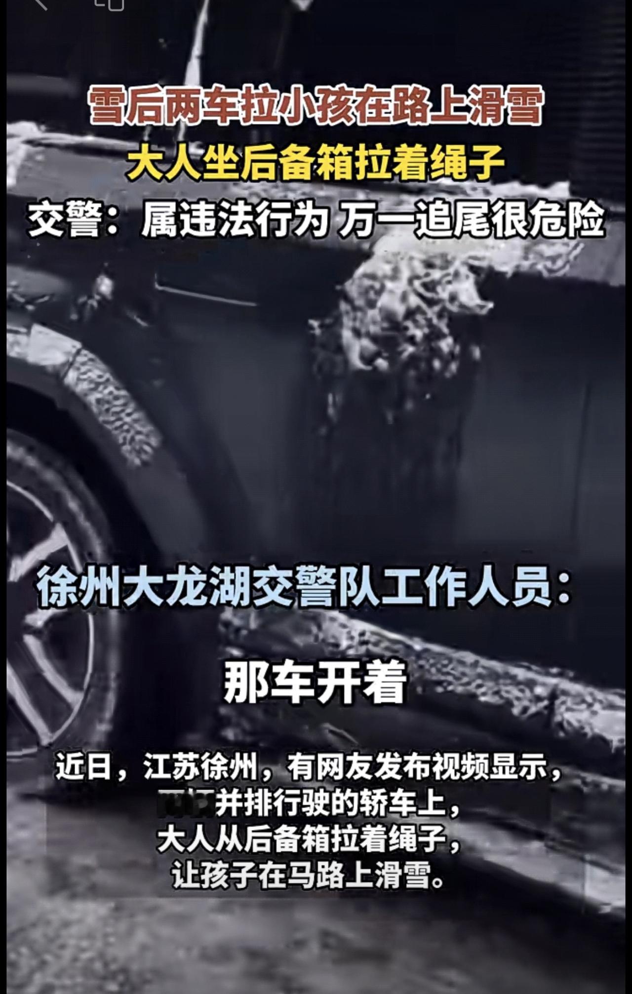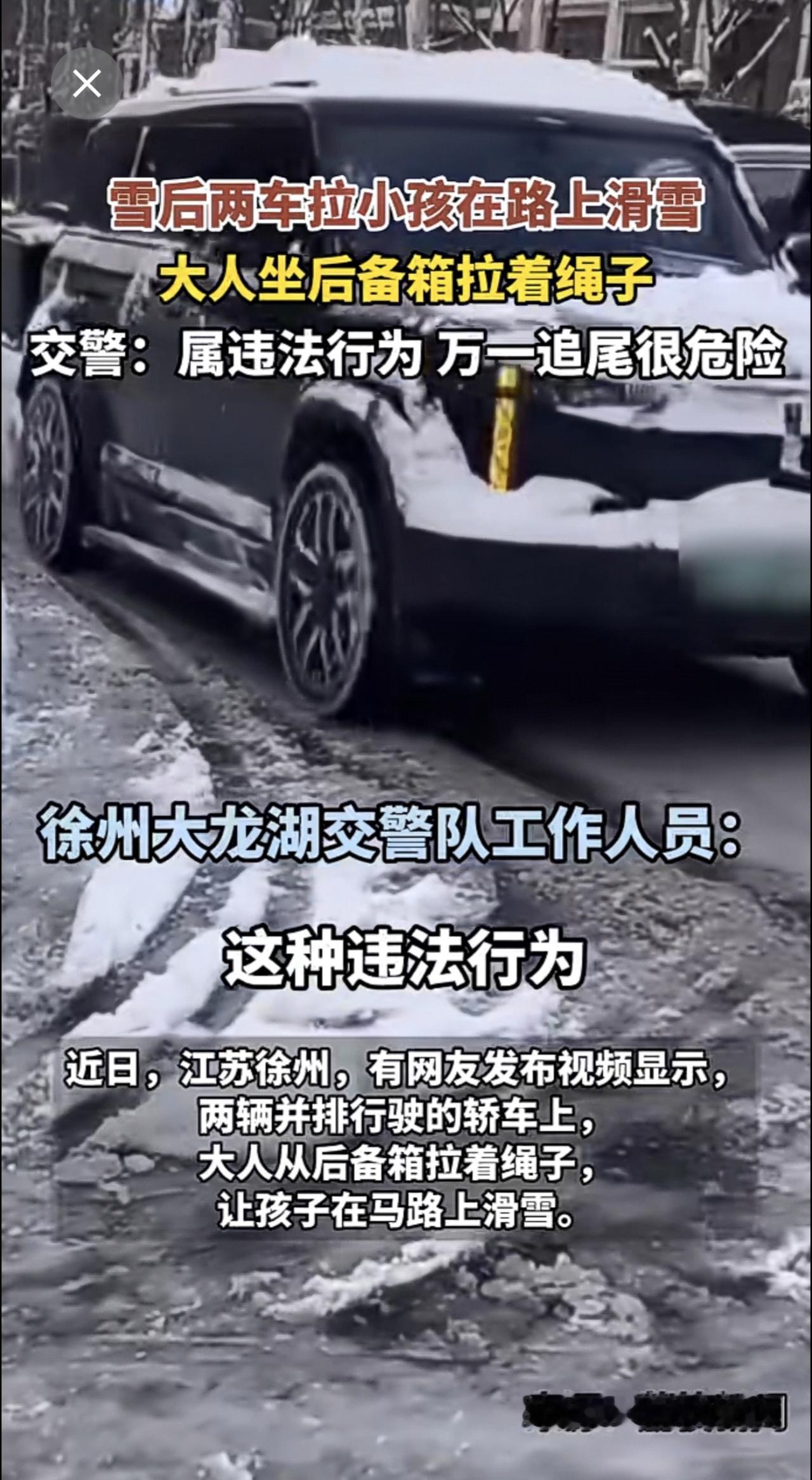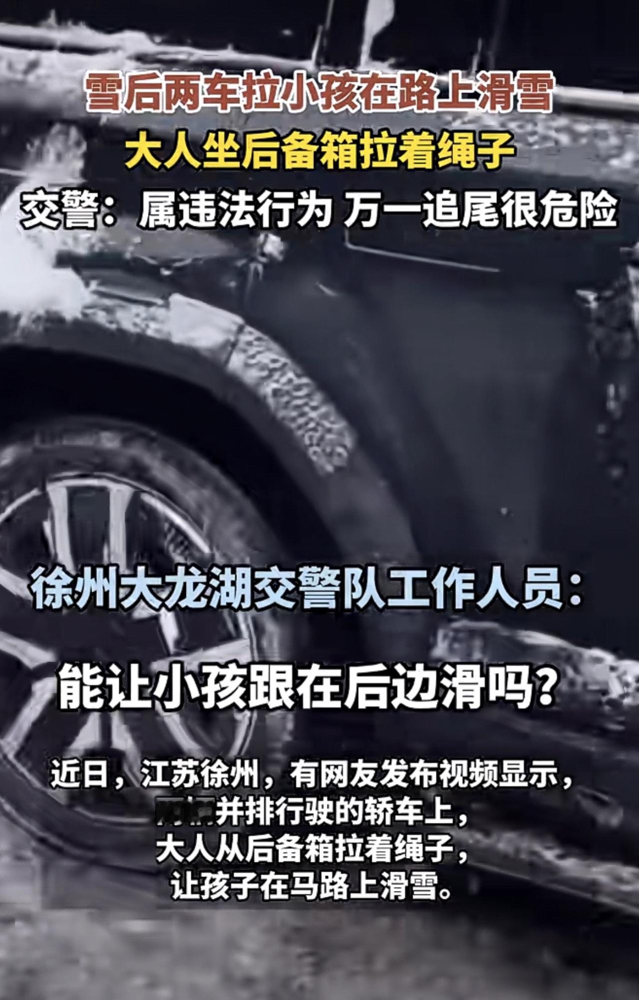 近日,江苏徐州。雪后两车拉小孩在路上滑雪,大人坐后备箱拉着绳子,警方:属违法行为,万一追尾很危险。