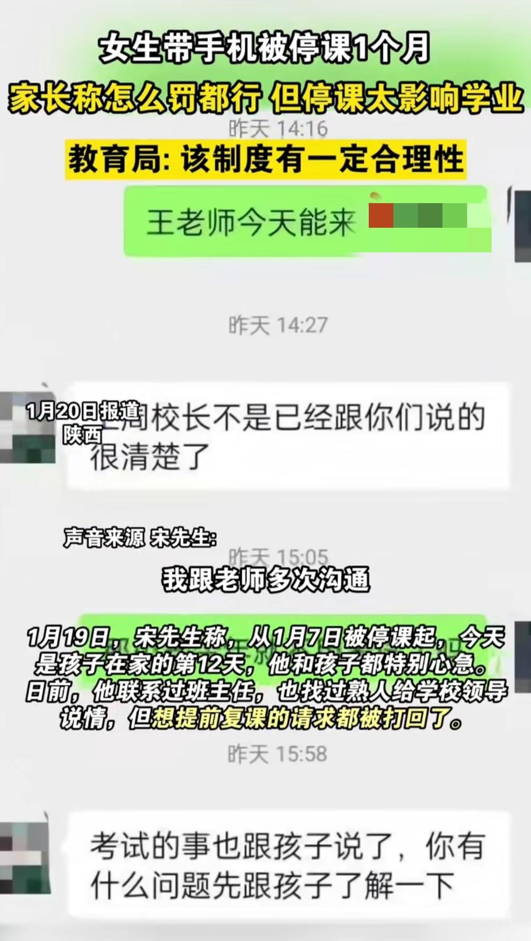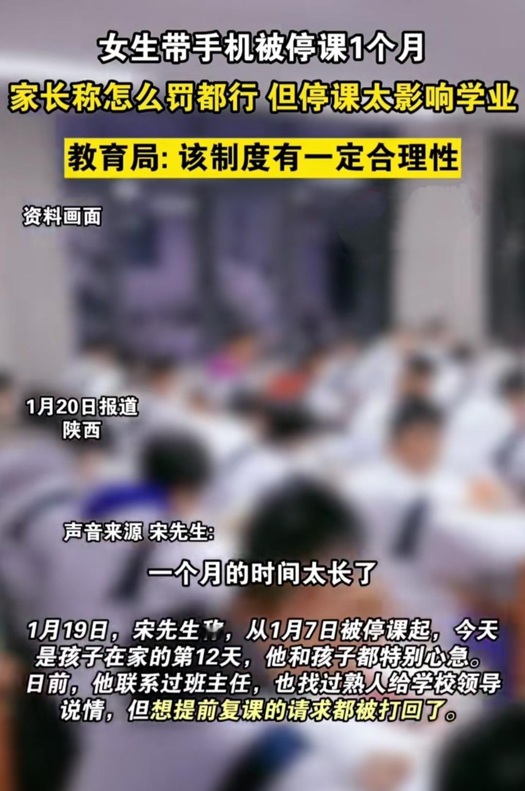 陕西柞水中学高一女生,在宿舍藏手机被宿管发现,按学校规定直接停了一个月课。从1月7日回家到19日,12天里,在西安打工的爸爸急得睡不好——马上要考试,落下的课程补都补不回来,孩子也在家蔫蔫的,总念叨“怕跟不上进度”。 家长放低姿态说“写检讨、罚扫一周地都成”,托熟人找校领导说情,连班主任都反复沟通,可提前复课的请求全被打回。教育局还称这制度“有一定合理性”,直到媒体问了,19号晚上学校才松口让孩子返校写反思材料。 上学谁没犯过点小错?学校立校规、严纪律是为了让孩子专心学业,可“停课一个月”的处罚,到底是警示还是耽误?比起一刀切的严惩,有没有既守规则又不影响学业的办法?你们觉得这种情况该怎么平衡才合理?