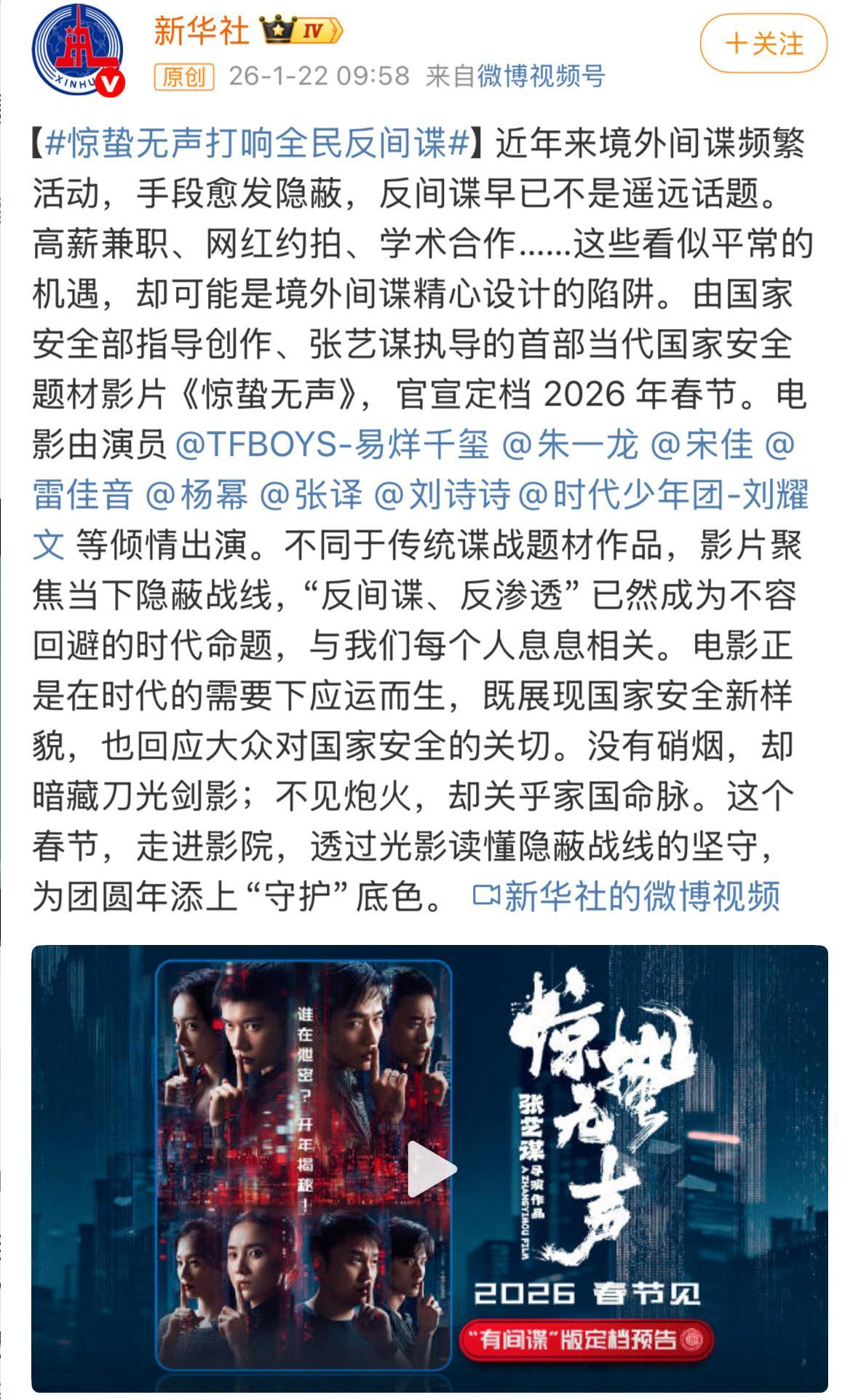 📣易烊千玺 朱一龙 宋佳 雷佳音 杨幂 刘诗诗 刘耀文 惊蛰无声定档春节档❗
