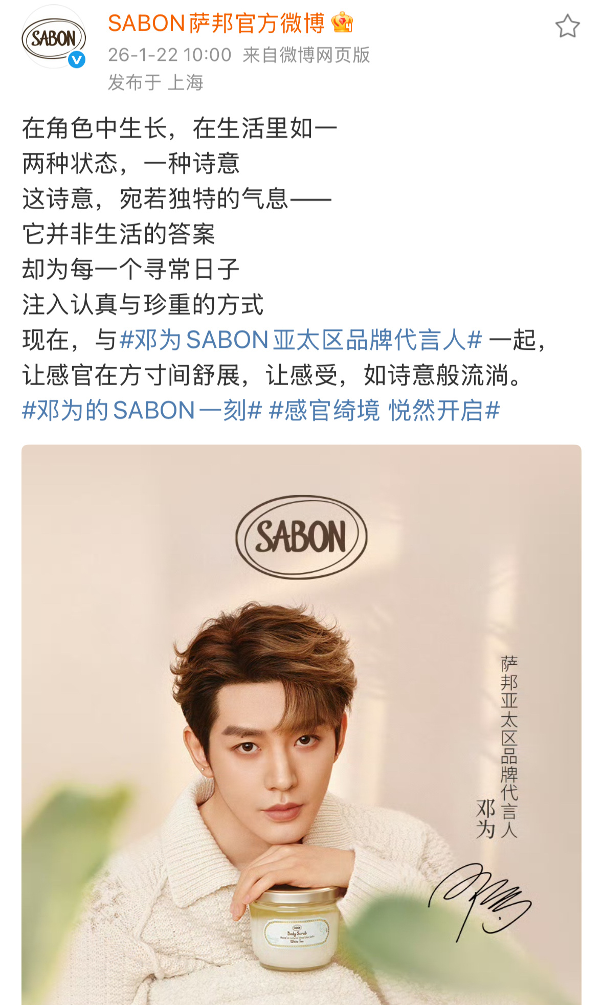 今日,邓为新代言SABON亚太区品牌代言人正式官宣,为为的气质和品牌完美契合,被邓为香到了,天选代言人,恭喜!!!!🎉
