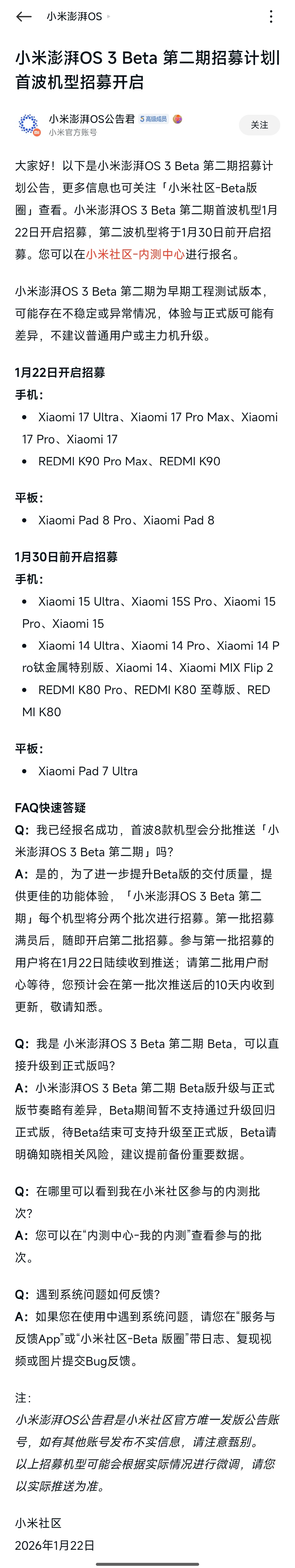 澎湃OS 3的新一轮Beta版招募开始了,赶紧看看你的机型能不能申请吧。参与第一批招募的用户将在1月22日陆续收到推送,第二批用户预计会在第一批次推送后的10天内收到更新。1月22日开启招募 手机: Xiaomi 17 Ultra、 Xiaomi 17 Pro Max、 Xiaomi 17 Pro, Xiaomi 17 REDMI K90 Pro Max, REDMI K90 平板: Xiaomi Pad 8 Pro, Xiaomi Pad 8 1月30日前开启招募 手机: Xiaomi 15 Ultra、 Xiaomi 15S Pro、 Xiaomi 15 Pro、Xiaomi 15 Xiaomi 14 Ultra, Xiaomi 14 Pro、Xiaomi 14 P ro钛金属特别版、Xiaomi 14、Xiaomi MIX Flip 2 REDMI K80 Pro、REDMI K80 至尊版、RED MI K80 平板: Xiaomi Pad 7 Ultra