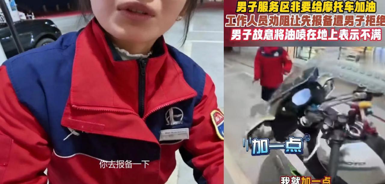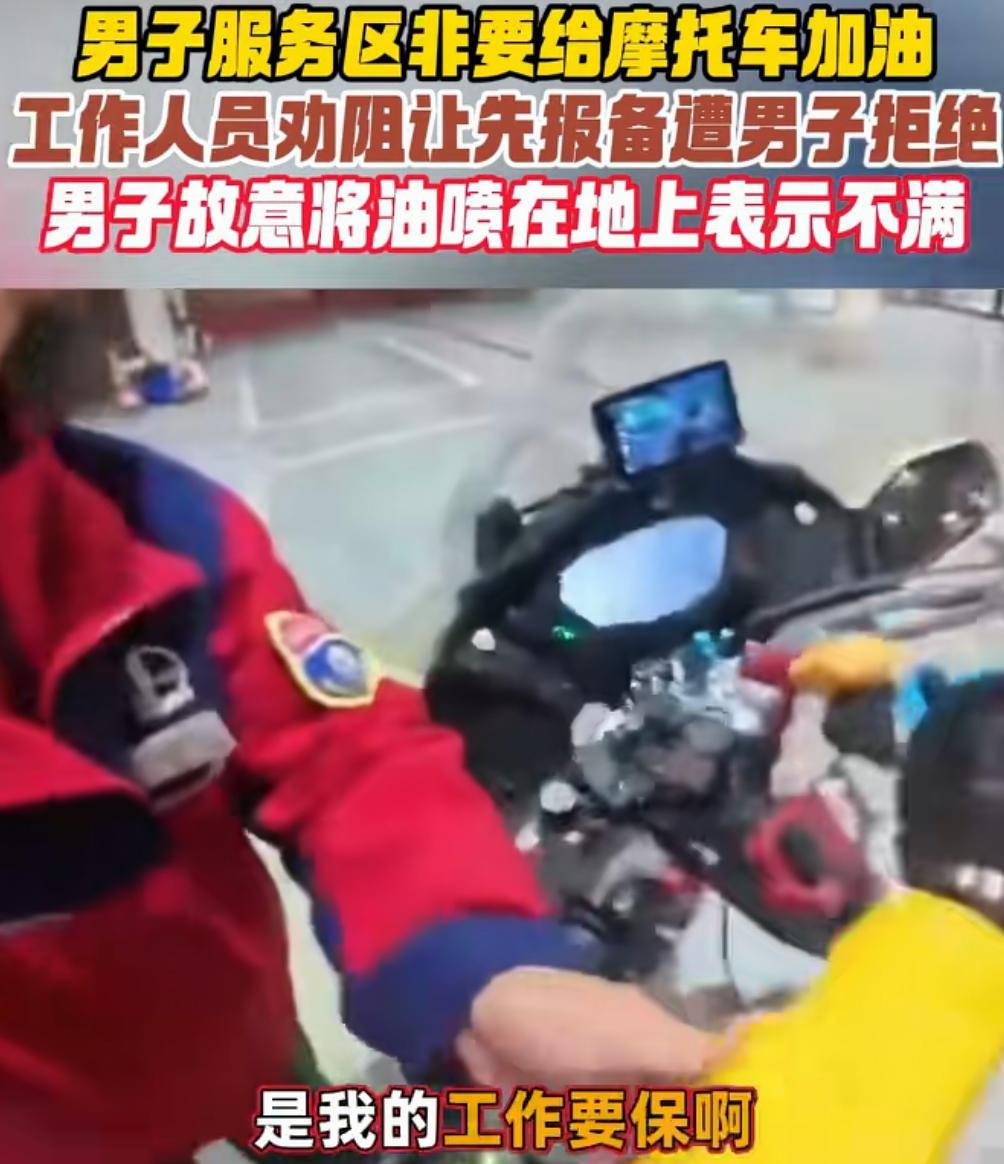 猖狂!重庆一男子在高速服务区给摩托车加油,工作人员让其先报备,男子拒绝后故意将油喷在地上。 该视频是当事男子发出来的,有点炫耀的意思,因为最后他还是强行加了点油开走了,不过评价对他指责较多,当前该条视频已被他删除。 很快有网友就扒出了该男子的账号,从内容看,他是一个“摩友”,视频多是各类骑行视频,粉丝不多,说话嚣张,时常带有挑衅意味。 有人不理解,摩托车有牌有证,加油为什么要报备。因为每个地方的规定不一样,有些地方摩托车是不允许上高速的,有些地方是禁摩的。 还有一种情况,摩托车是从能上高速的地方上来的,可到了不能上高速的地界没油了,加油站谁敢给加,当然需要报备一下,加油站工作人员做没没毛病。 有重庆当地网友也证实,在重庆给摩托车加油,不能直接加注进摩托车,有专门用的桶。另外,摩托车在重庆不能上高速,所以服务区加油站,就没有给摩托车加油的那个桶。 这名男子故意把汽油泚到地上,涉嫌违法,行为有给公众造成危险的可能,属危害公共安全,工作人员好言相劝,他仍我行我素,建议严惩。 本来不是什么大事,好好沟通报备一下就解决的事,非要把事闹大,还自发视频网曝自己,孰不知汽油泚地上就是另一个事故了,删视频已经来不及了,手镯喜提者非他莫属! 高速上摩托车 重庆高速摩托车