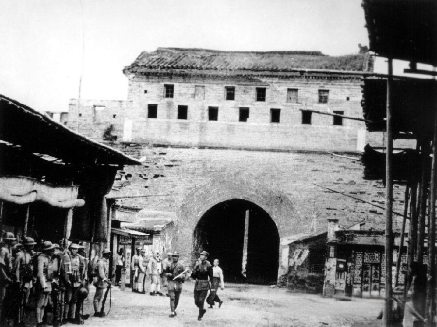 1937年,“七七事变”爆发后,宛平城东门(顺治门)紧闭,斑驳的砖墙上留有密集的射击孔,城楼的垛口清晰可见。城门下的街道两侧是简陋的商铺与棚屋,我军列队在街边警戒,压抑的氛围透露出战事一触即发的紧张感。 1937年7月7日夜,日军在卢沟桥附近演习时,借口士兵失踪要求进入宛平城搜查,遭中国守军拒绝后悍然发起攻击,“七七事变”全面爆发。驻守宛平城的二十九军官兵奋起抵抗,打响了全民族抗战的第一枪。此后日军迅速包围宛平城,这张照片中紧闭的城门,正是事变后城池被围、守军坚守的真实写照,标志着中国从局部抗战进入全面抗战阶段。