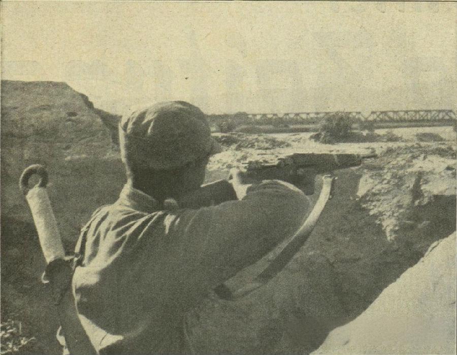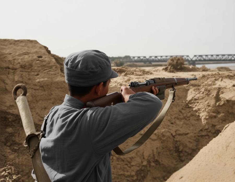 这张战地照片,定格了全面抗战爆发初期,国民革命军第二十九军战士在北平近郊的防御瞬间。 镜头里,战士蹲伏在掩体中,背向镜头举枪瞄准远方,背上斜挎的大刀是二十九军最标志性的装备,在简陋的战地环境里格外醒目。远处的平汉铁路桥清晰可见,这座连接华北与中原的交通枢纽,正是敌我双方激烈争夺的咽喉要道。 1937年“七七事变”爆发后,驻守平津的二十九军奋起抵抗。这支因长城抗战中“大刀队”夜袭日军而闻名的部队,在北平近郊的卢沟桥、宛平一线布防,平汉铁路桥是其重点防御的核心节点。战士们以步枪加大刀的简陋装备,坚守阵地,试图阻止日军南下的步伐,这张照片正是该军保卫北平的真实写照。