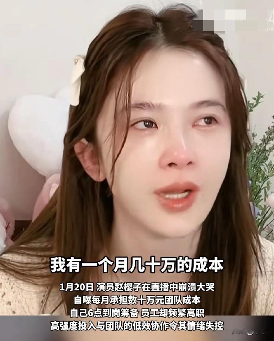 演员赵樱子在直播间哭诉,自己每个月要付给员工很高的工资,一个月几十万的成本!
