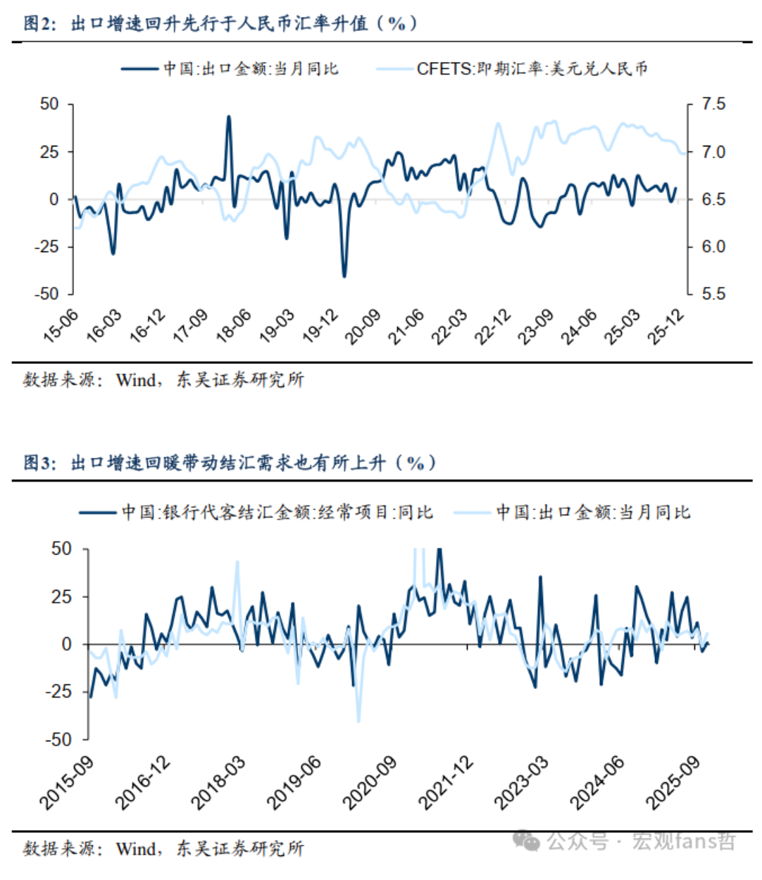 “8·11汇改”以来,人民币对美元即期汇率走势和我国出口走势具有一定相关性,但相关性并不高且近几年明显走弱,2015年9月到2025年11月间两者相关系数绝对值仅0.3%,2023年以来进一步走弱。