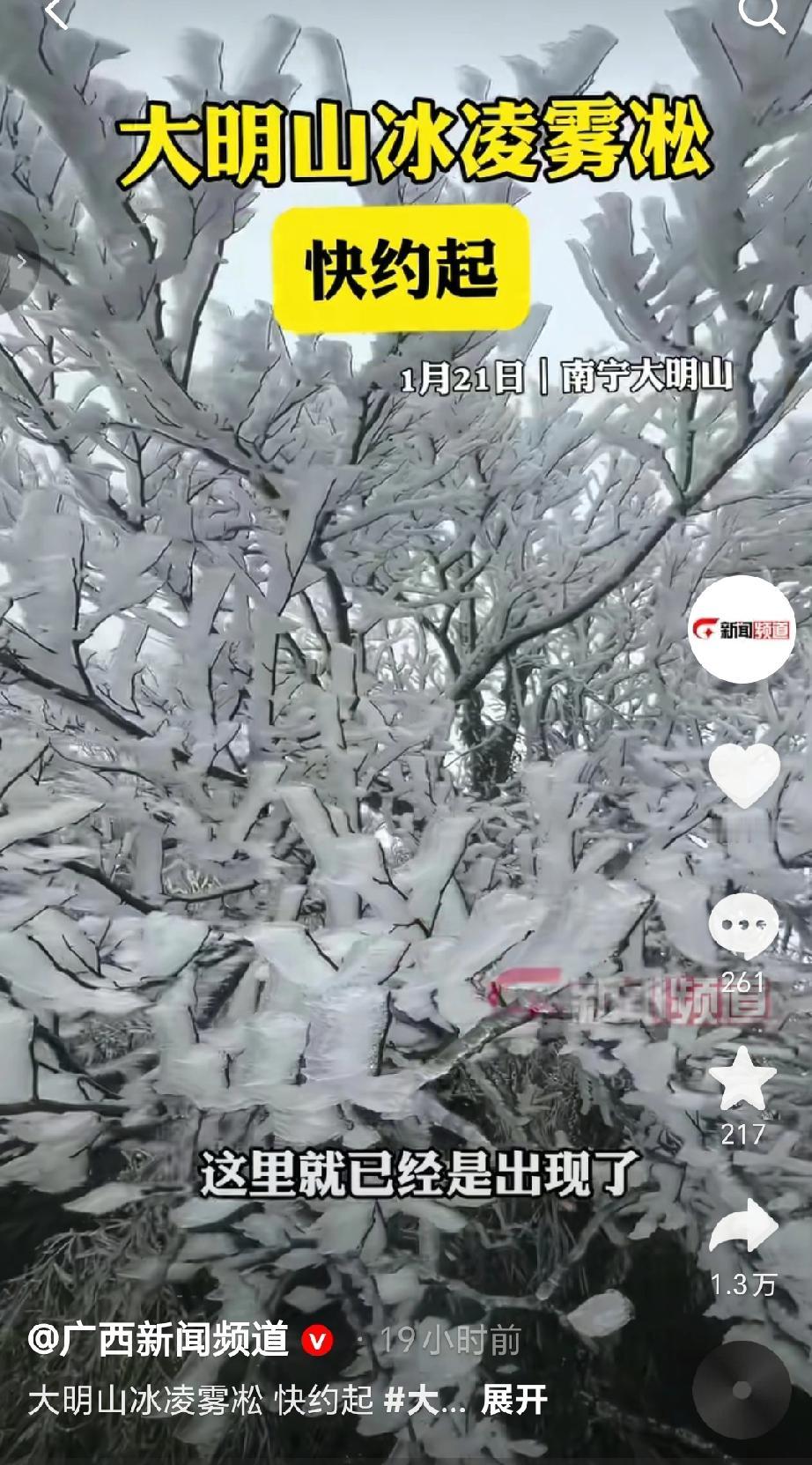 广西新闻频道记者王智慧于1月21日在南宁大明山进行报道,从当天早上6点开始,大明山的龙亭到大峡谷一带出现了晶莹剔透的冰凌雾凇景观,树木、植被被冰层包裹,景色非常漂亮,这里是欣赏冰凌雾凇的最佳区域,推荐大家前往观赏。(来源于@广西新闻频道 )