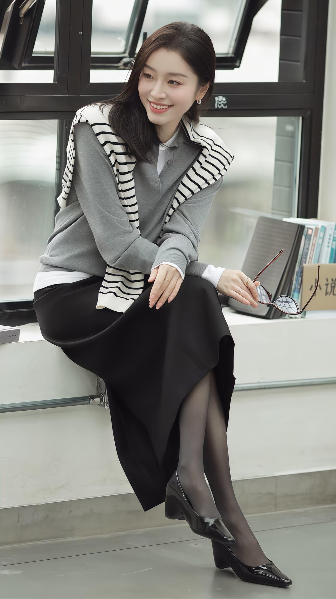 优雅职场风,黑白条纹外套搭配黑色长裙,尽显时尚与干练!