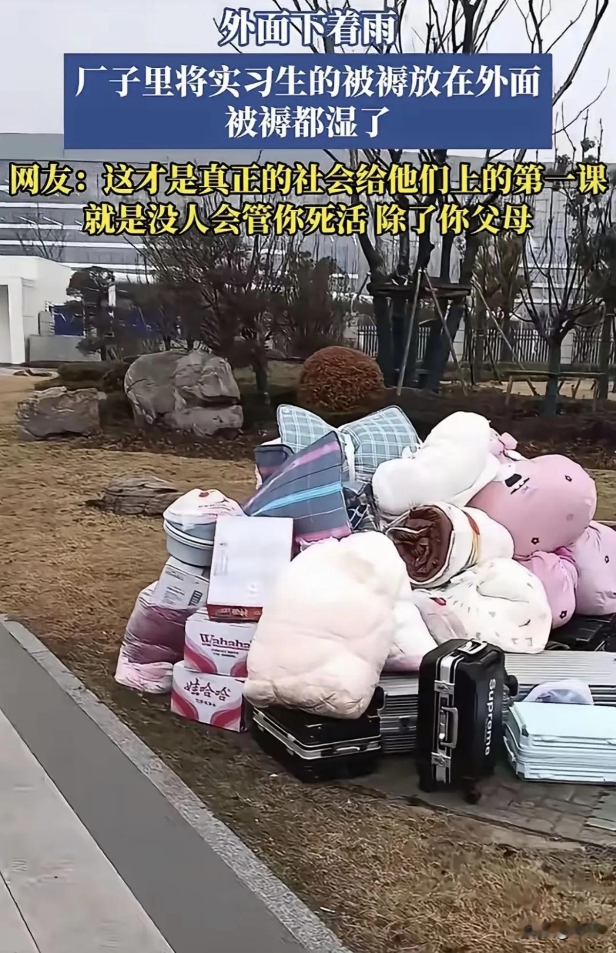 最苦莫过于实习生。 初入社会就经历了如此残忍的生活, 这也是告诉他们在谁顾上,除了自己的父母,没有人会在意你,更没有人去同情你。 看到某工厂的做法,也是心痛不已。回想起自己当年做实习生的时候, 这应该是报道的当天,所有实习生的行李都在外面放着,人却在场内开会或者上班。 而外头下的小雨把所有的被褥淋湿了,即便是有人路过,仍然没有人愿意帮助。 或许这群实习生也是看着窗外的雨,自己也是很无奈,无奈的是自己的被褥被雨淋湿了。 无奈的是没是有人愿意为他们提供帮助,这么冷的天气,他们夜晚又如何能够度过呢? 其实,这件事也是告诉了众人,踏入社会,所有的东西都要自己去争取。没人帮助那就自己去解决问题。