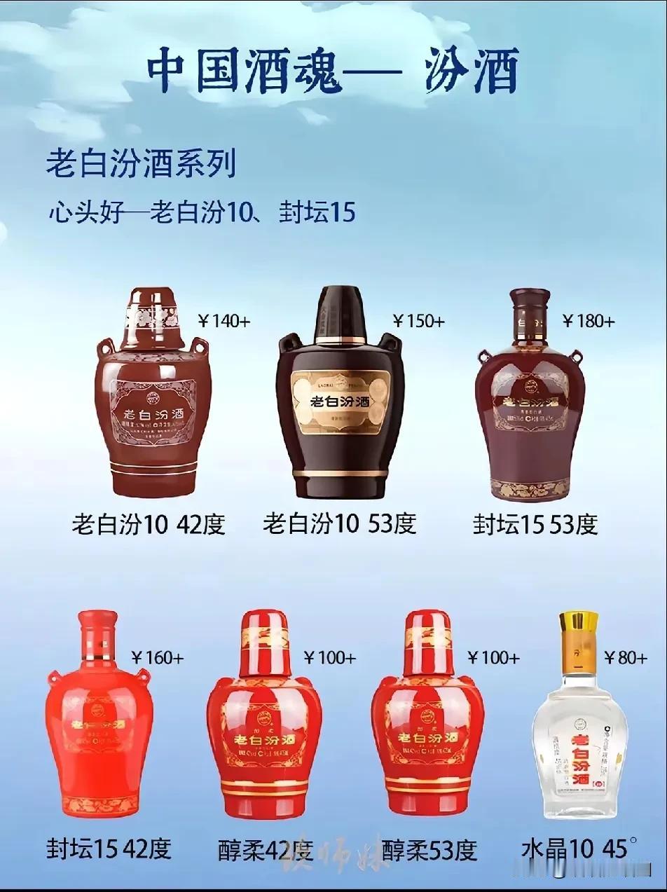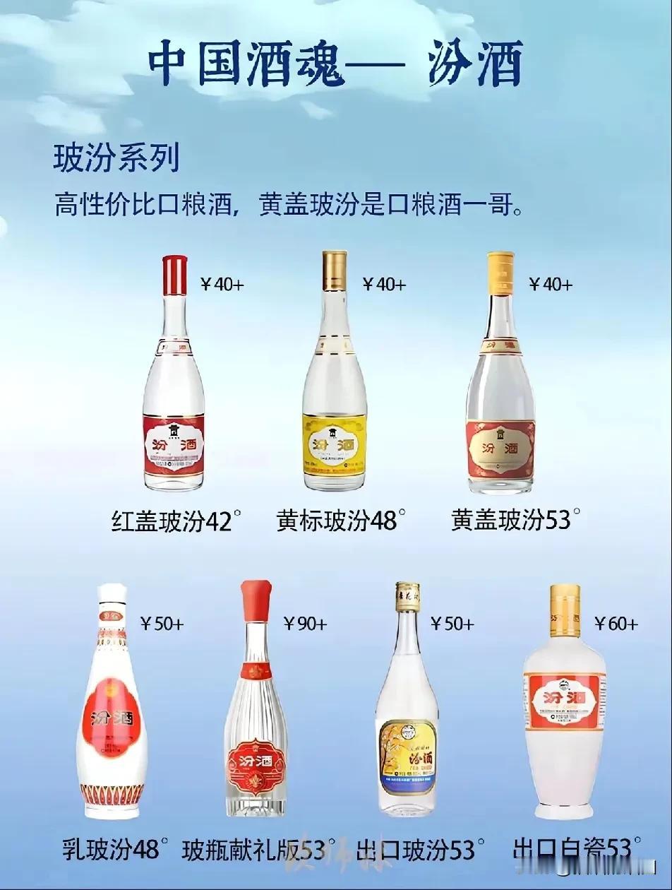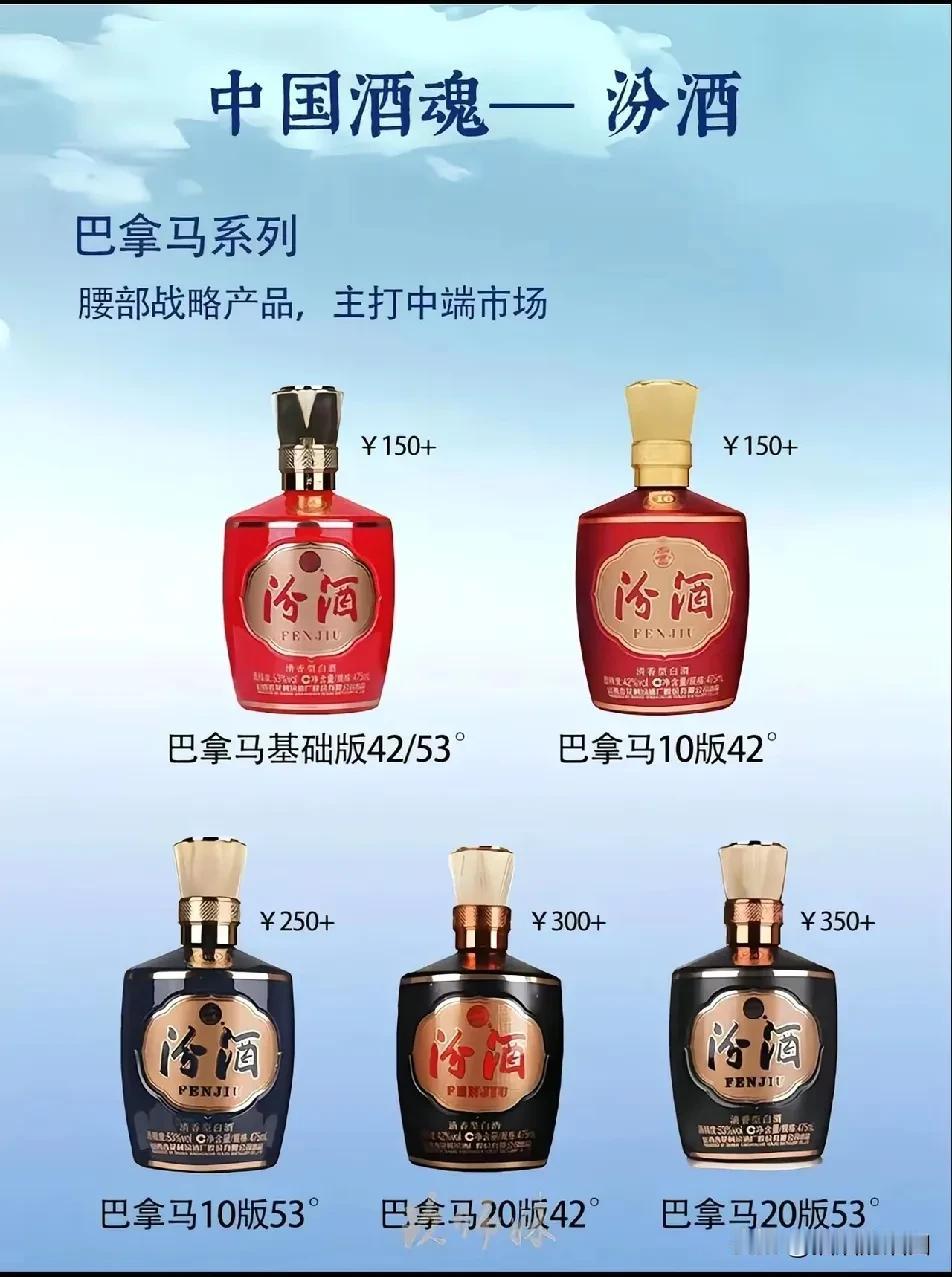 汾酒系列大全! 喝点比较多的,红盖汾黄盖汾,说实话,不咋好喝,感觉辛辣,又感觉很水,没有蓝瓶二锅头好入口。 一般的朋友聚会,喝巴拿马基础版红瓶的比较多,好入口,但是感觉很水。 一般差不多的商务宴请,汾20喝的比较多,价格上去了口感比上述两款要好的多。