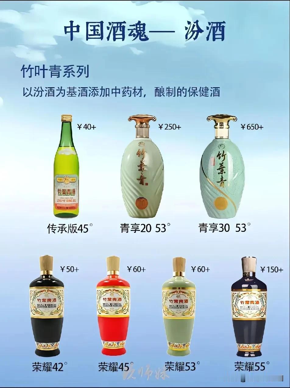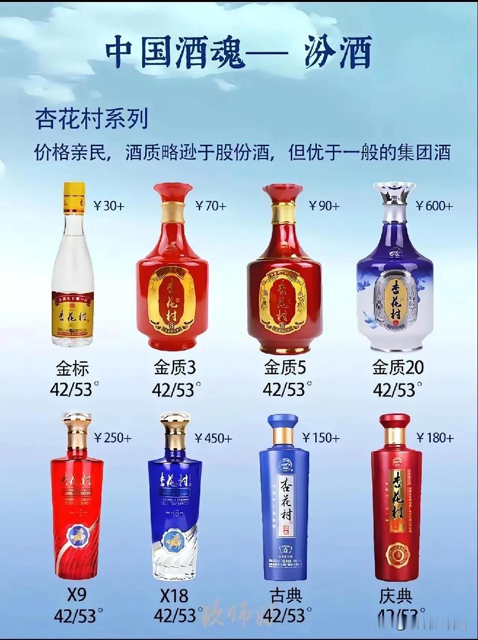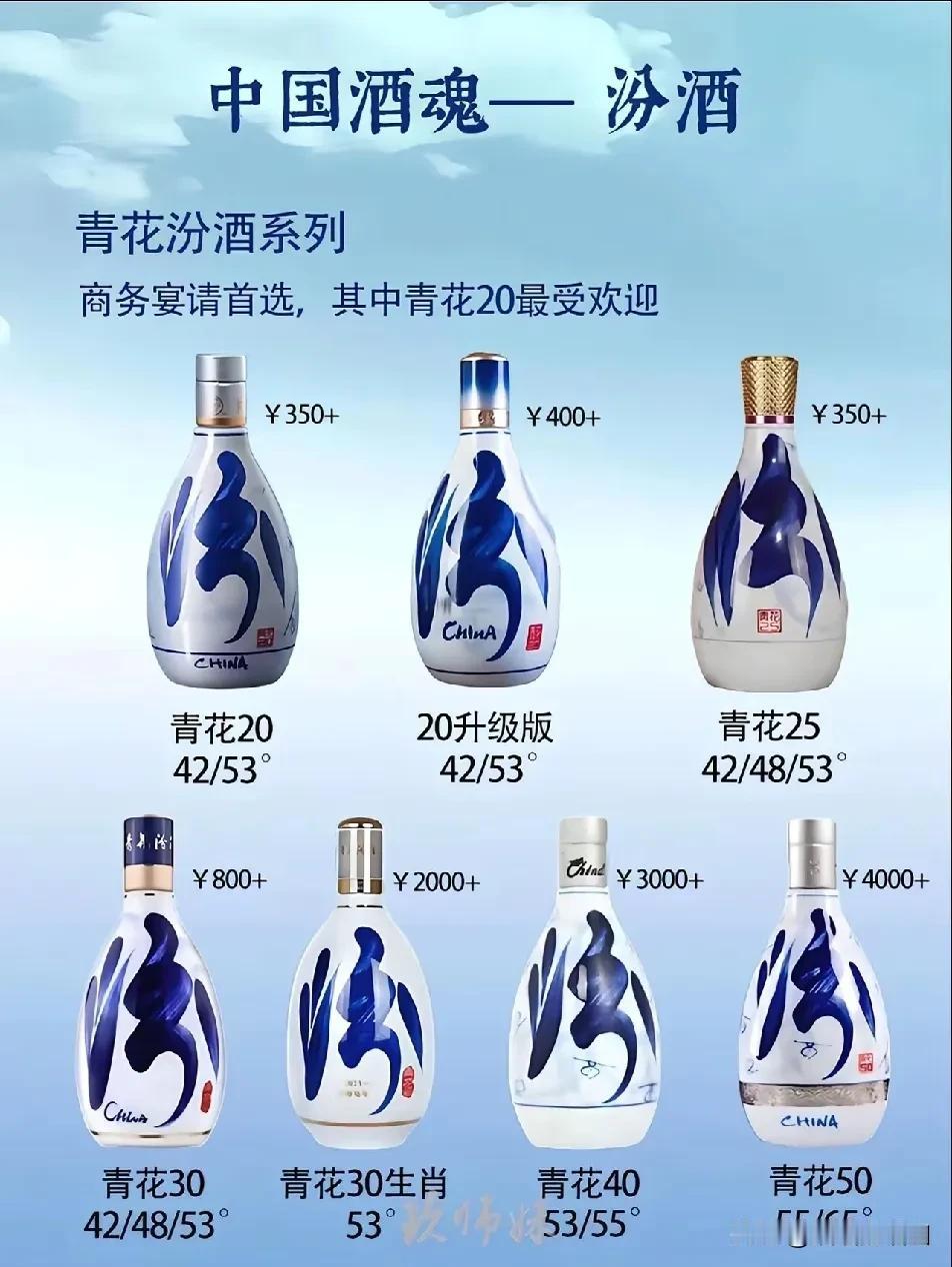 汾酒系列大全! 喝点比较多的,红盖汾黄盖汾,说实话,不咋好喝,感觉辛辣,又感觉很水,没有蓝瓶二锅头好入口。 一般的朋友聚会,喝巴拿马基础版红瓶的比较多,好入口,但是感觉很水。 一般差不多的商务宴请,汾20喝的比较多,价格上去了口感比上述两款要好的多。
