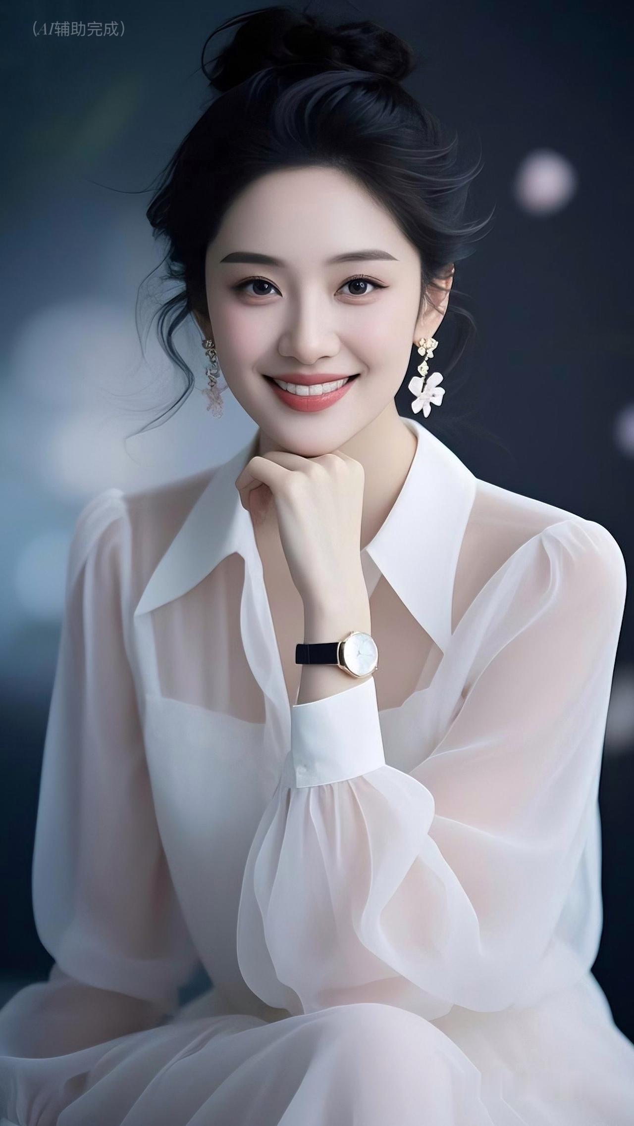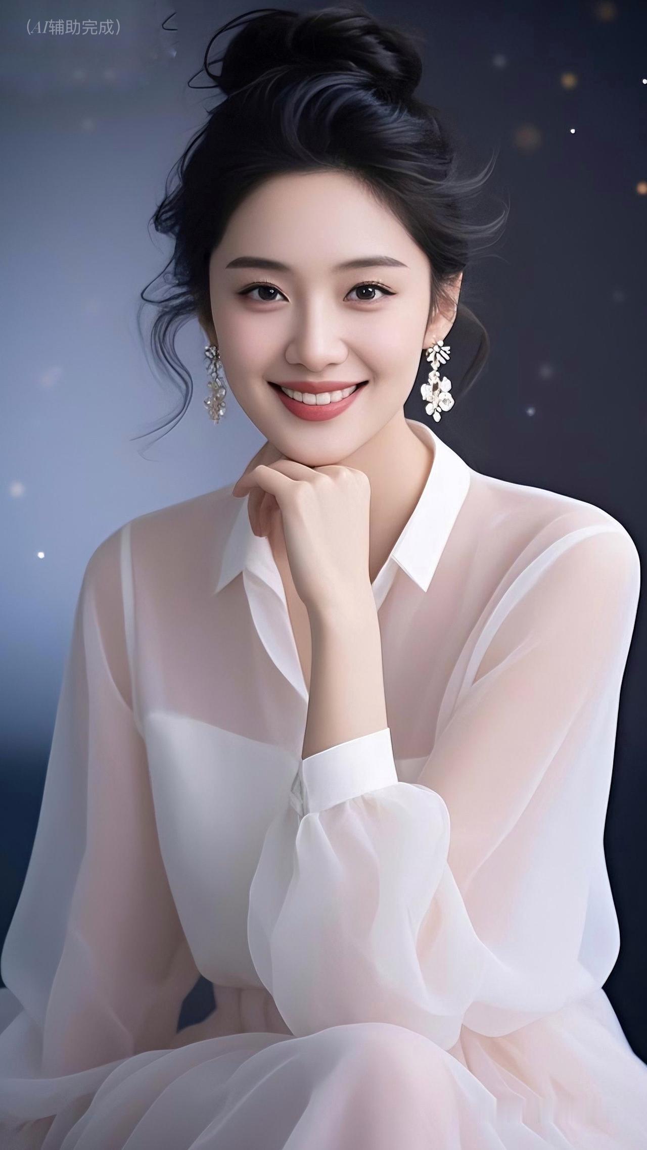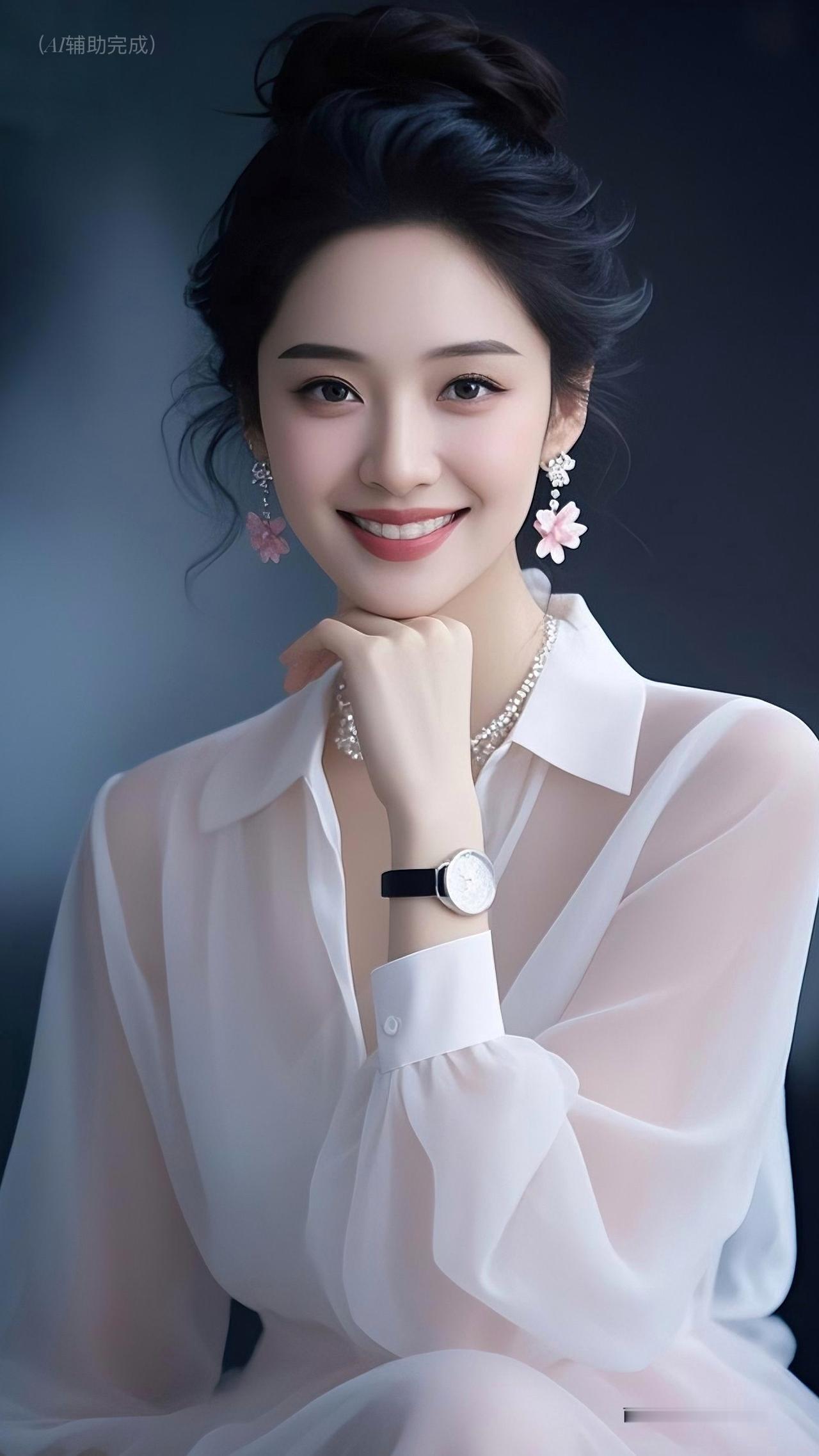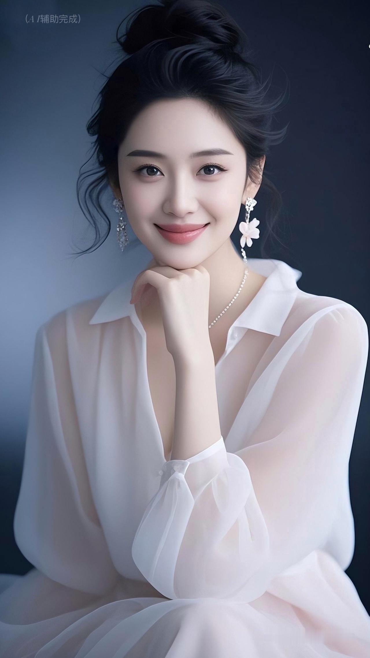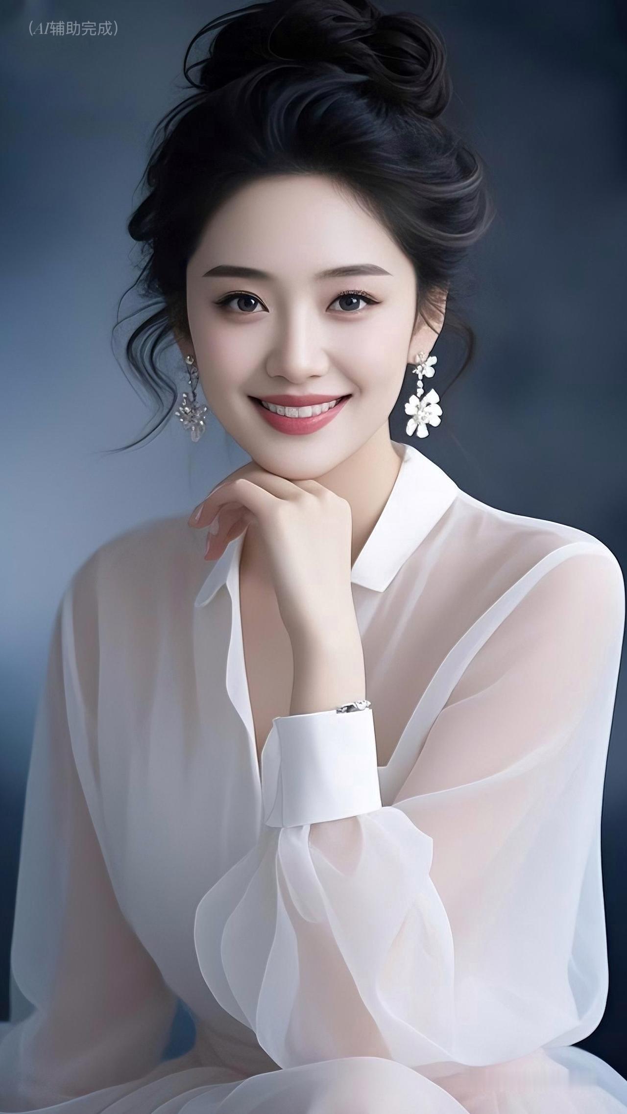 深蓝衣裹温婉,盘发垂碎发添柔。蓝宝钻石耳坠项链映眸,眉眼弯弯笑靥甜,眼神亮如星。