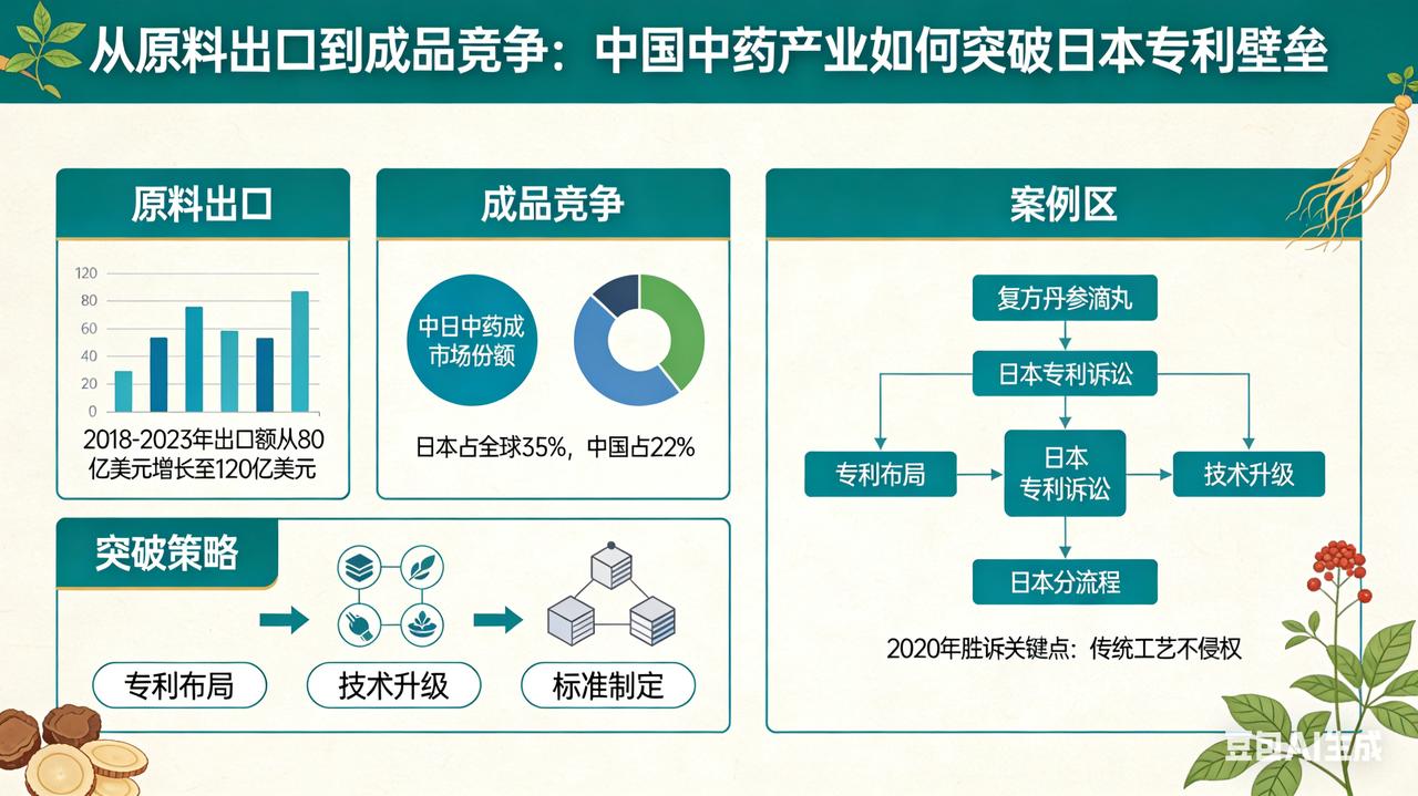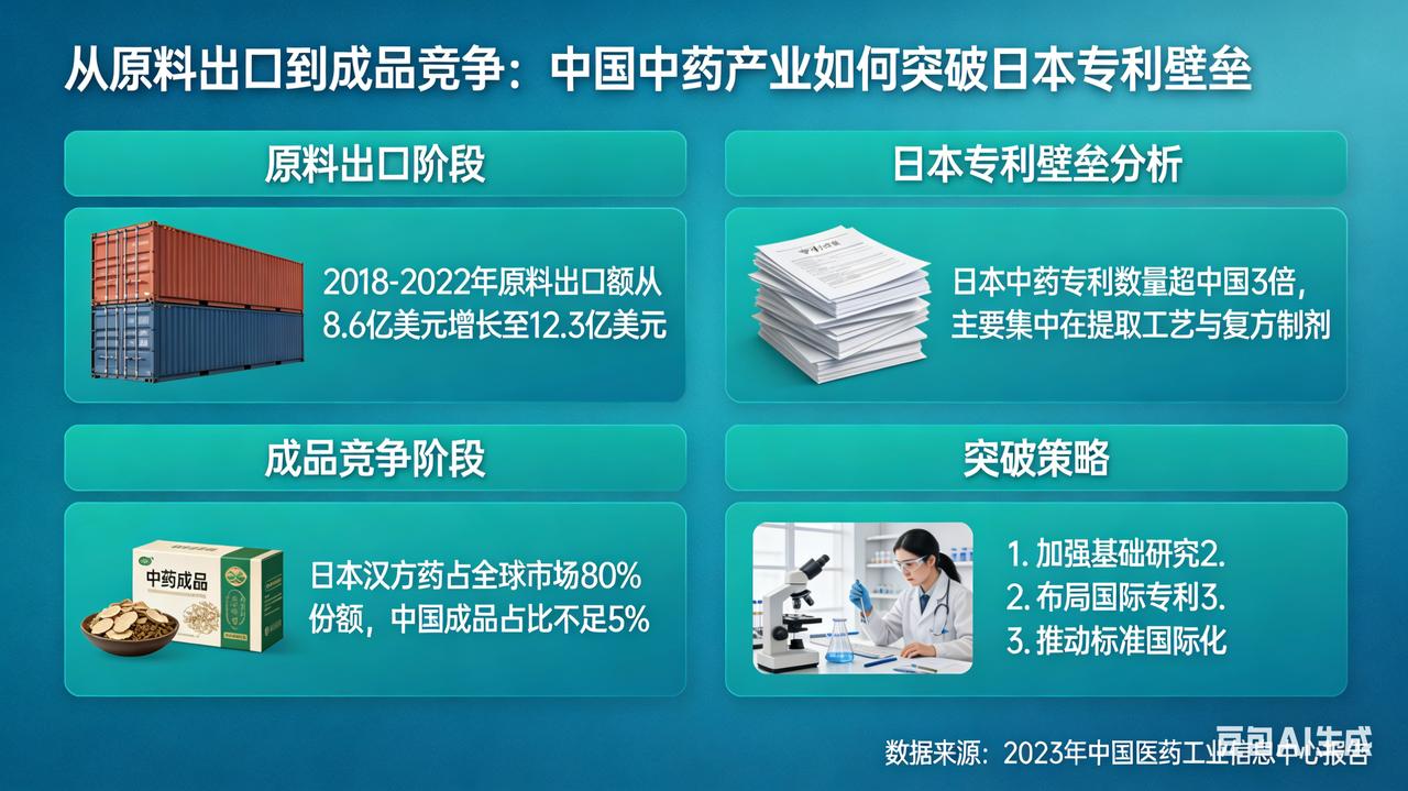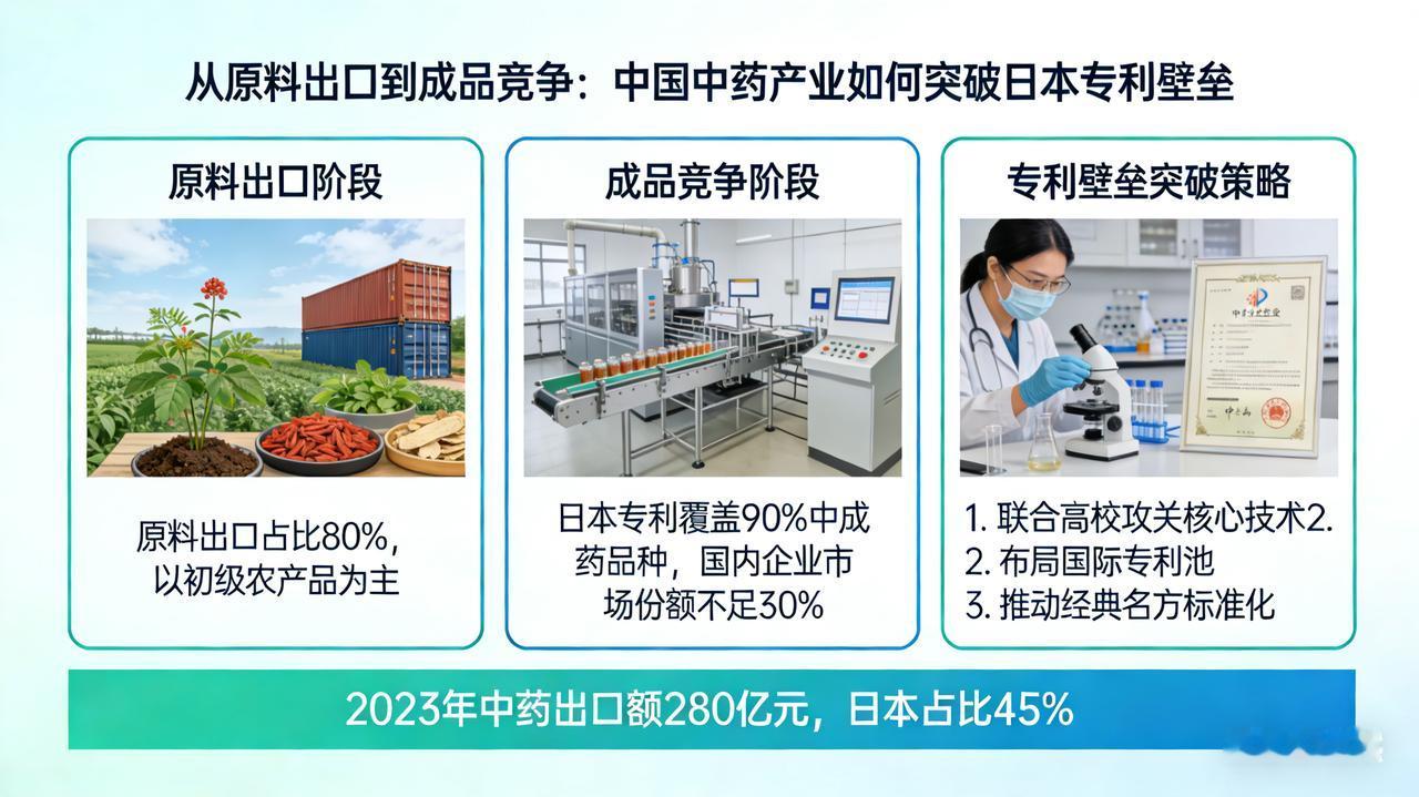 从原料出口到成品竞争:中国中药产业如何突破日本专利壁垒 这不仅是商业的悲剧,更是一场令人扼腕的文化掠夺!本是华夏文明积淀千年的国粹——中医药,如今却面临“中国原产、日本结果、还要向日本纳税”的荒诞局面。这背后作祟的,是日本资本精密如围棋般的战略布局,更是我们自身在意识与制度上的巨大短板。 日本对中医的“去中国化”运作早已不是秘密。他们不仅在20世纪70年代就将汉方药纳入医保,更在国际专利战场上步步为营。数据触目惊心:全球中药相关专利中,日本与韩国竟占据70%以上,而作为源头的中国仅占区区0.3%!这意味着,六味地黄丸等经典古方,被日本企业稍加改良申请专利后,我们使用自家的方子竟成了“侵权”,必须缴纳高昂的授权费。 资本的獠牙更是凶狠。日本津村制药通过平安津村,豪掷49亿日元全资收购了拥有115年历史的陕西紫光辰济药业。这不仅是一次商业并购,更是对中医药命脉的精准掐断——日本方瞬间掌控了158个国药准字号产品,未来我们生产销售这些“国粹”,竟要按日本人的规则来,甚至如纳税般缴纳费用。 更雪上加霜的是,2026年起日本将实施新政,废除小额免税制度,对来自中国的商品强制征收10%消费税。这一政策利剑直指中国跨境电商,意图通过税收壁垒绞杀中国商品的竞争力。 究其根源,除了日本政府的政策扶持与资本的野心,我们自身的“内伤”更为致命:药材质量标准化缺失、年轻人对中医的误解、甚至国内舆论场中“中医无用论”的甚嚣尘上,都在为外资的长驱直入铺路。当日本人用我们的药材赚着暴利,还反过来向我们收税时,这记耳光打醒了所有人:守护国粹,不仅要靠情怀,更需铁腕的专利保护与不容妥协的产业标准!