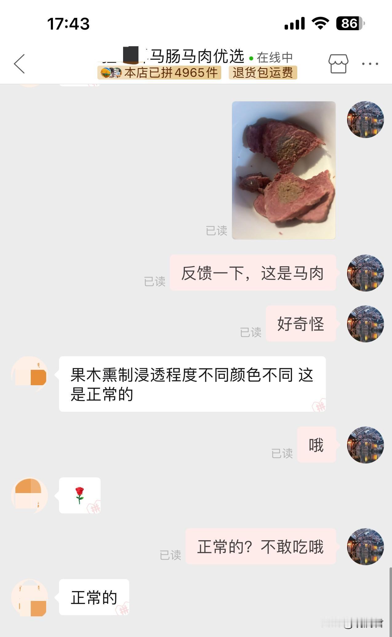 熏马肉这个样子正常吗? 第一次在网上买熏马肉,没想到煮熟后切开了是这个样子的,太奇怪了。反馈给商家他说是正常的,我不敢吃。
