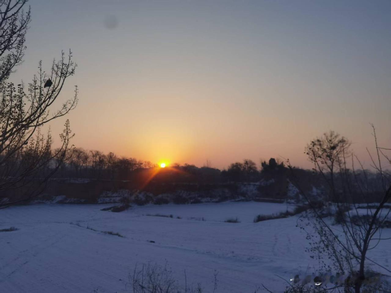 早起出门,就看见这一幕,赶紧拿着手机拍下这一幕。 雪还没化,踩上去咯吱响,空气冷得吸鼻子。远处太阳刚拱出树梢,把天边染成暖乎乎的橙黄色,雪地上的光都软乎乎的。 树枝光秃秃的,在淡蓝的天空下支棱着轮廓,倒也有种干净的劲儿。这时候村子里还静悄悄的,只有几只麻雀在树杈上蹦跶。 站在雪地里,看着太阳一点点往上爬,突然觉得这早起的冻脚都值了。日子嘛,不就是这样,冷归冷,但总有这么点暖乎乎的盼头,像这日出一样,稳稳当当就来了。
