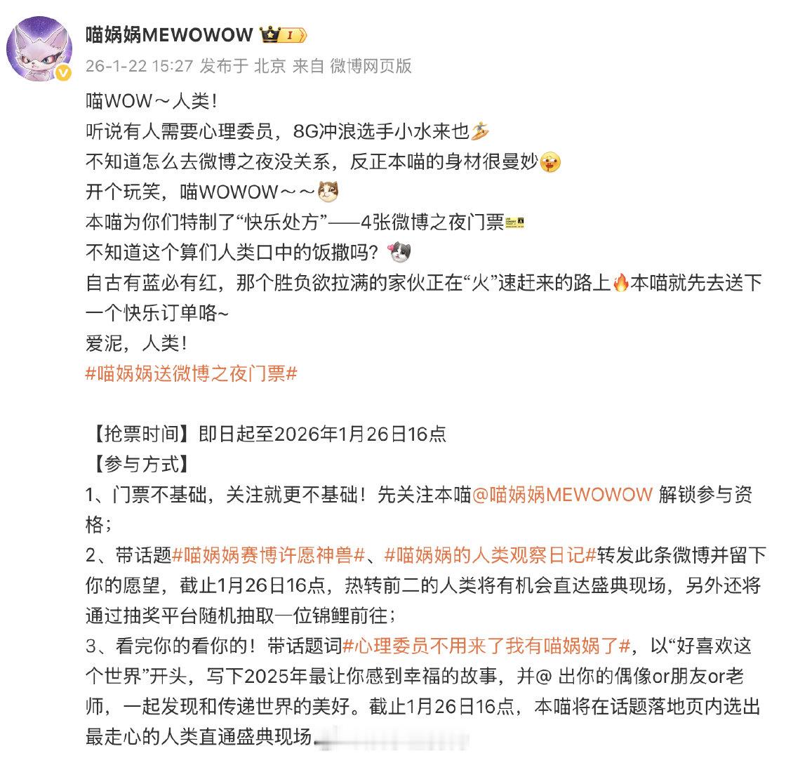 逆风如解意 喵娲娲宠me 小水的快乐处方生效了!4张微博之夜门票治愈所有不开心,心理委员可以下班了,有喵娲娲就够了!