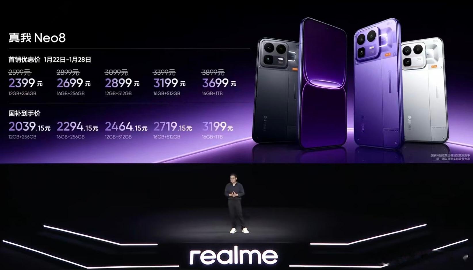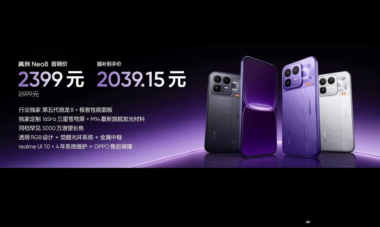 周边配置方面,真我Neo8给了3D超声波指纹、IP66/68/69防尘防水、X轴马达0809、双扬声器、双频GPS、三频北斗、NFC和红外遥控。价格方面,12 + 256GB版售2399元起(国补完2039元起),真真还是猛啊,这价格你们买不买
