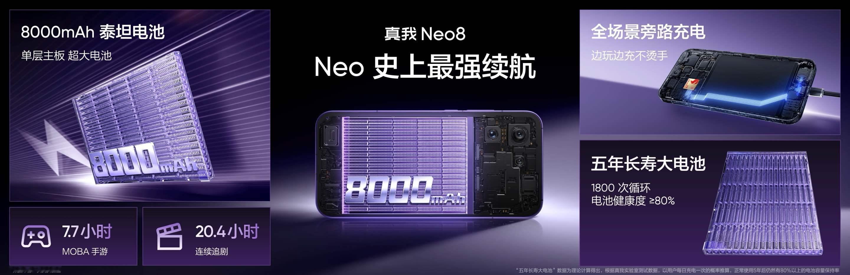 真我 Neo8搭载同档罕见5000万像素索尼OIS潜望长焦,支持3.5倍光学变焦,7X无损变焦、最高120倍超清变焦。 搭载8000mAh泰坦电池,5年长寿持久耐用,全新realme UI7.0,支持IP66+IP68+IP69满级防尘防水,苍穹智慧地图、旗舰级超声波3D指纹、超线性立体双扬声器、X轴线性马达等,全面旗舰体验一次到位。