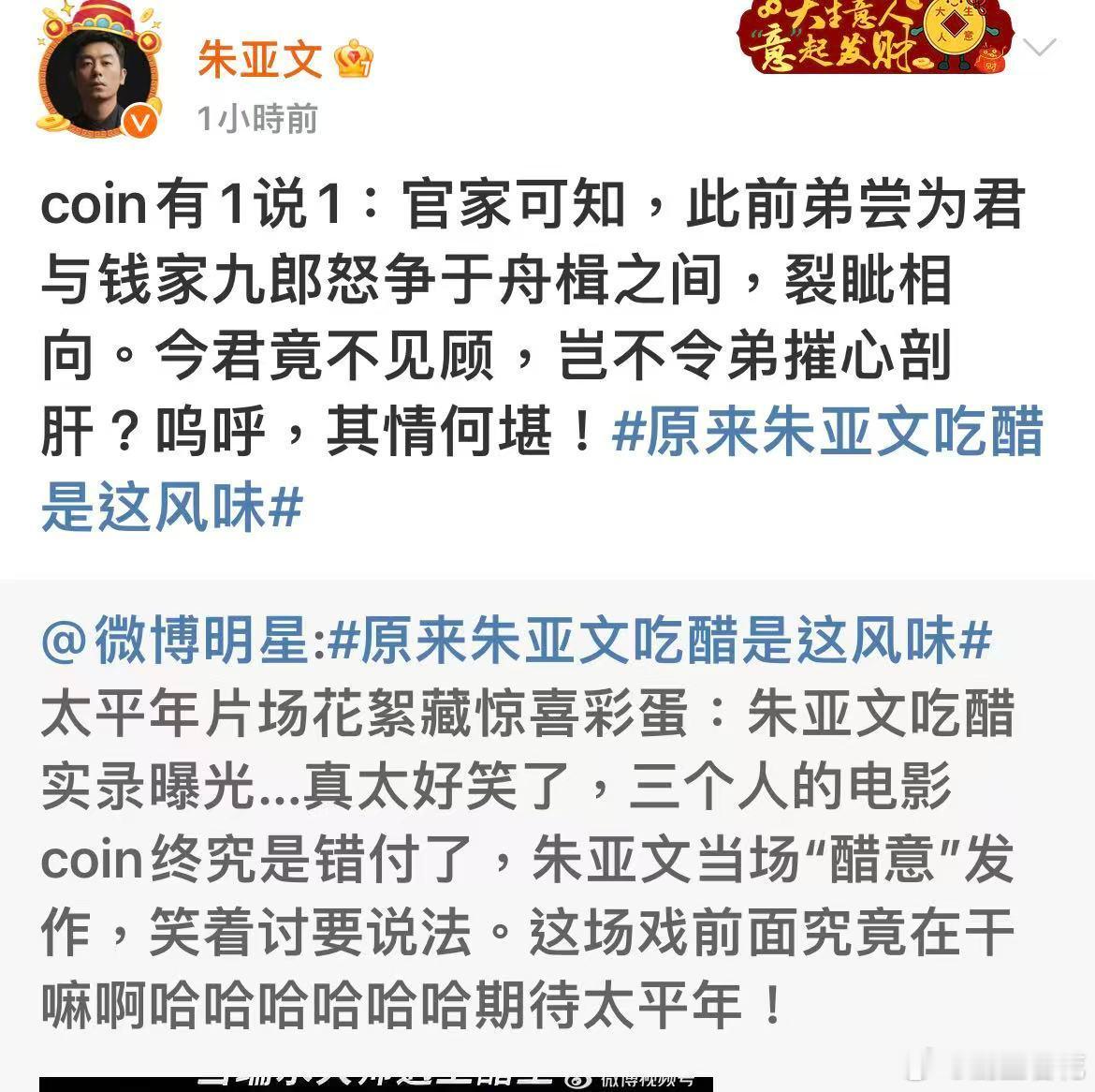 随橙想朱亚文反耳是个古风coin 笑疯了!朱亚文古风coin号上线,文言文控诉没被看一眼,醋精本精心碎成渣,傲娇coin哥太可爱!
