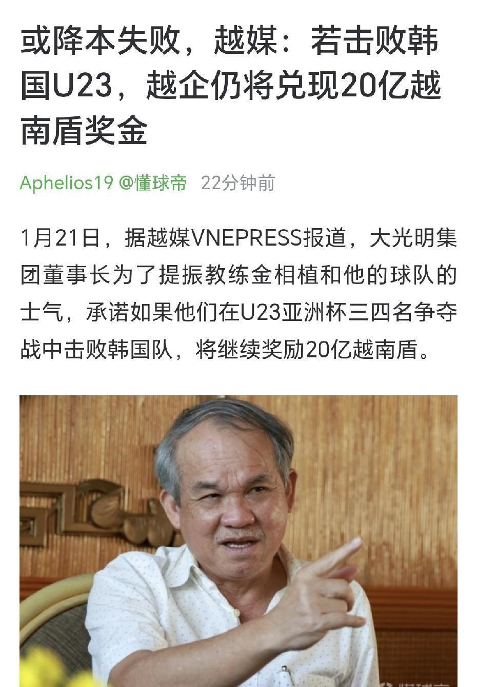 我当时愣了一下,手机都停在那条消息上—— 人家原本说的那笔20亿越南盾(差不多53万人民币)奖励,越南输给中国后居然又改口:只要在三四名决赛打赢韩国,照样给。还顺手说自家青训每人再拿2亿……嗯,这话一出,韩国队感觉就像被莫名点名了。 我一方面能理解想激励球队的心情,毕竟士气低落;但另一方面又觉得怪怪的—— 把未兑现的“面子钱”转到别队头上,这操作是谁想出来的? 换我可能也会有点别扭,韩国队真有点冤。 反正我有点接受不了这种做法,你们觉得这是激励,还是有点像借机博眼球