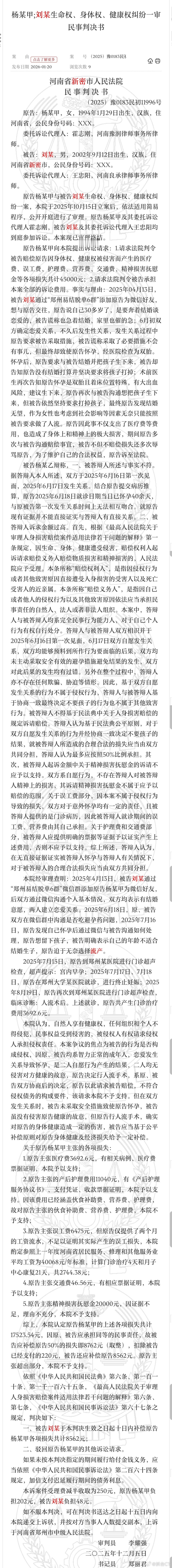 小伙致女友怀孕称年龄不适合结婚这个小伙,就是典型的新时代男性。戴不戴套,女方决定,生不生育,女方决定。因为,女方有的是生育决定权,而他有的只是生育建议权。他建议她不生,她可以生,也可以不生。生了的话,给抚养费就行;不生,顶多事后给点补偿。大家可以重点看下法院的说理部分:“本案争议的焦点为被告的行为是否构成侵权,因原、被告均系智力正常的成年人,恋爱发生关系导致怀孕,是二人自愿行为产生的结果,二人均无侵害对方健康的故意,原告决定行人流手术,系原、被告双方协商后的决定,原告以此请求被告赔偿,不符合侵权债务的构成要件,该请求本院不予支持。”“但在双方发生关系时,被告未采取安全措施致使原告怀孕,被告虽没有侵害原告健康的故意,但原告行人流手术,确实对原告的身体健康造成一定的伤害,被告应当基于公平补偿原则对原告身体健康及经济损失给予一定补偿。”这话说得足够明白。侵权是不存在侵权的,后面给的8700块钱,只是基于公平原则的补偿。我觉得,伴随着女性越来越独立,这块补偿也要慢慢缩减,直至消失。现在的补偿,终归是要被扫进故纸堆的老思想。实务案例看一看