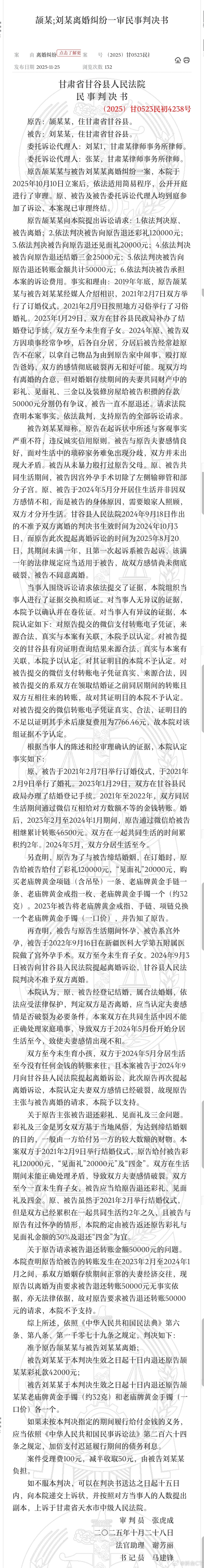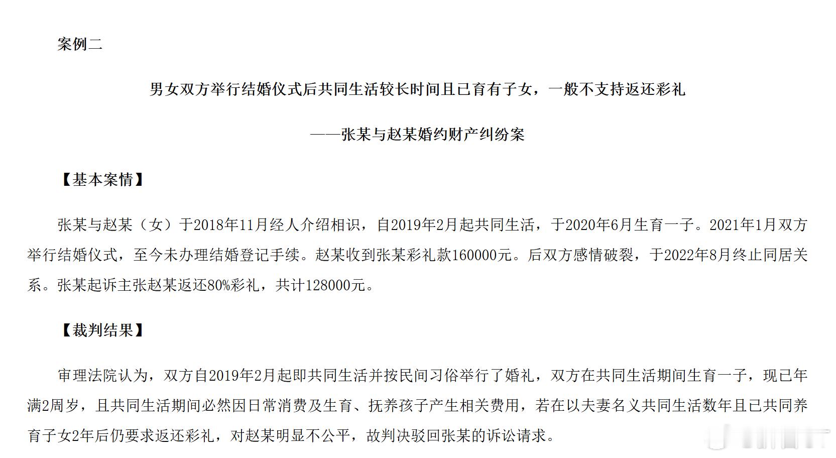 宫外孕切子宫离婚却被索要彩礼这案子,我觉得能拿回来30%的彩礼,就已经很不错了。要是换个偏向女方的法官判案,搞不好分币不退。图1是该案的具体裁判文书,内容很简单。男女双方是2019年底认识的,2021年2月办的席,2023年1月领的证,2024年打的第一次离婚,当时的原告就是现在的被告。男方诉求,判决两人离婚,并要求女方返还彩礼12万,见面礼2万,三金2.5万,转账5万,合计21.5万。但法院认定的彩礼额,只有彩礼12万,见面礼2万,最终判决返还彩礼额的30%,即4.2万,另需返还三金首饰。理由是,双方已经共同生活2年,且女方还怀过孕。这个返还比例,可能有人会觉得少。但如果大家去看彩礼新规刚施行时公布的典型案例二,大概率会惊奇的发现,这案子其实是可以判决不返还彩礼的。所以我说,这案子,能返还30%,他就偷着乐吧。实务案例看一看