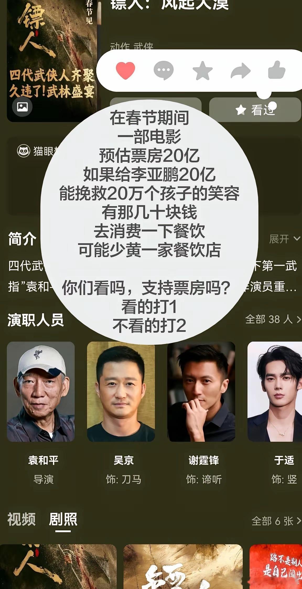 在春节期间,一部电影,预估票房20亿,如果给李亚鹏20亿,能挽救20万个孩子的笑容,有那几十块钱,去消费一下餐饮,可能少黄一家餐饮店。你们看吗,支持票房吗?看的打1,不看的打2。