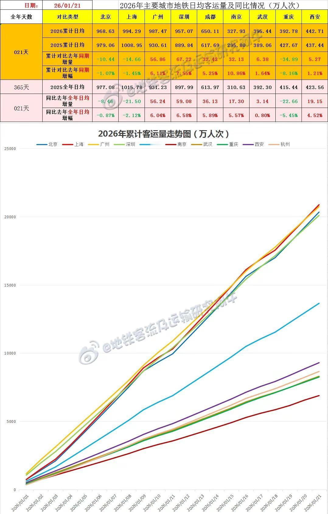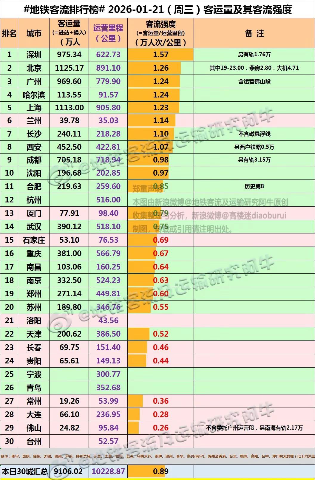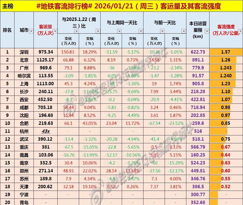 【中国城市地铁客流排行榜 2026-01-21(周三,农历腊月初三】北京1125.17万(其中19-23.00,燕房2.80,大机4.71),上海1113万,深圳975.34万(另有轨1.76万),广州969.6万,成都705.18万(另有轨3.15万),西安452.5万(另西户铁路0.5万),武汉390.12万,重庆381.0万,……余见下表(1-客运量排序,2-客流强度排序)