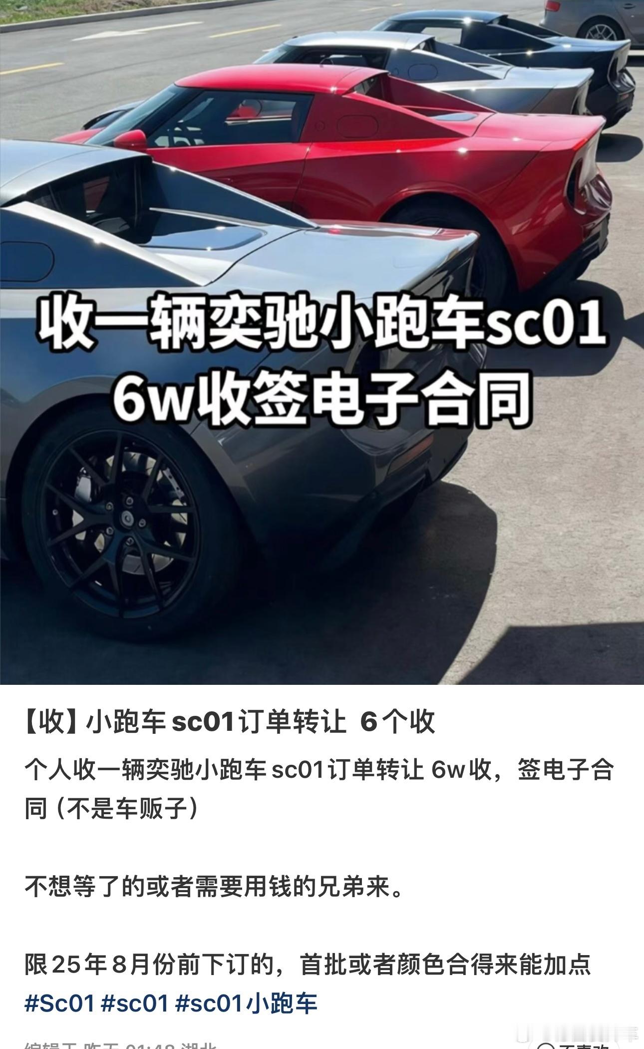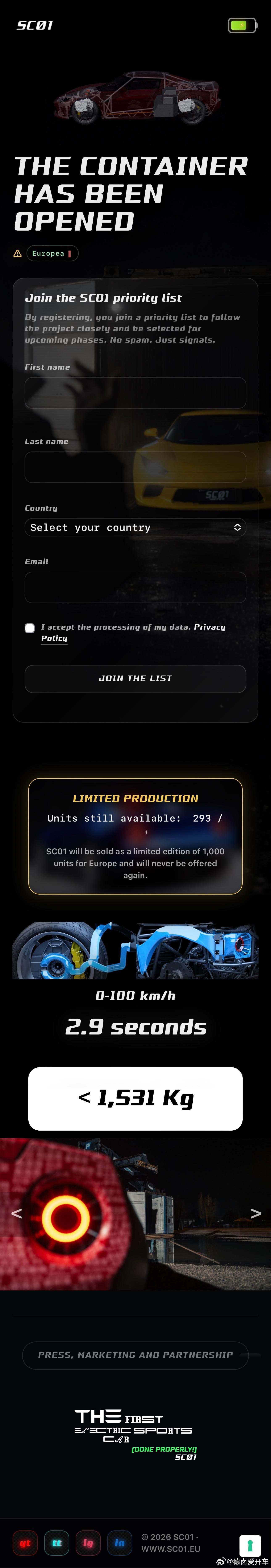 小跑车 SC01 在欧洲开启用户预订,限量 1000 台且售罄后将不再开售,预计车辆将在意大利本土组装生产;这应该是中国新能源、汽车文化的里程碑。——————另外由于产能原因目前这车订单还能加价卖,这个情况大家恐怕更想不到吧。