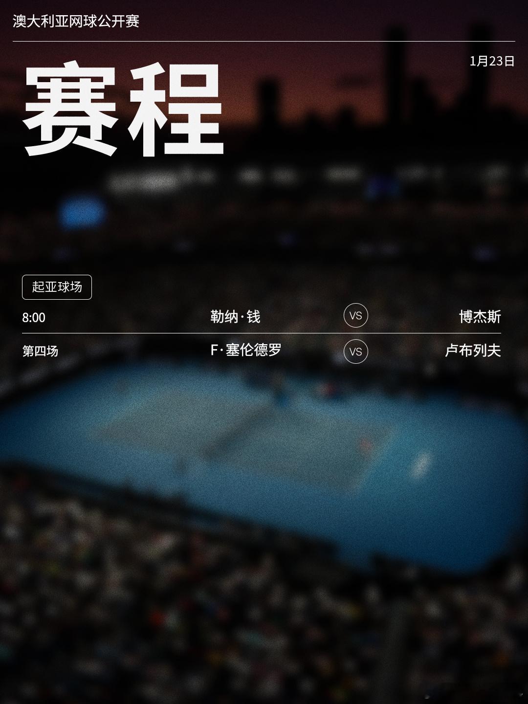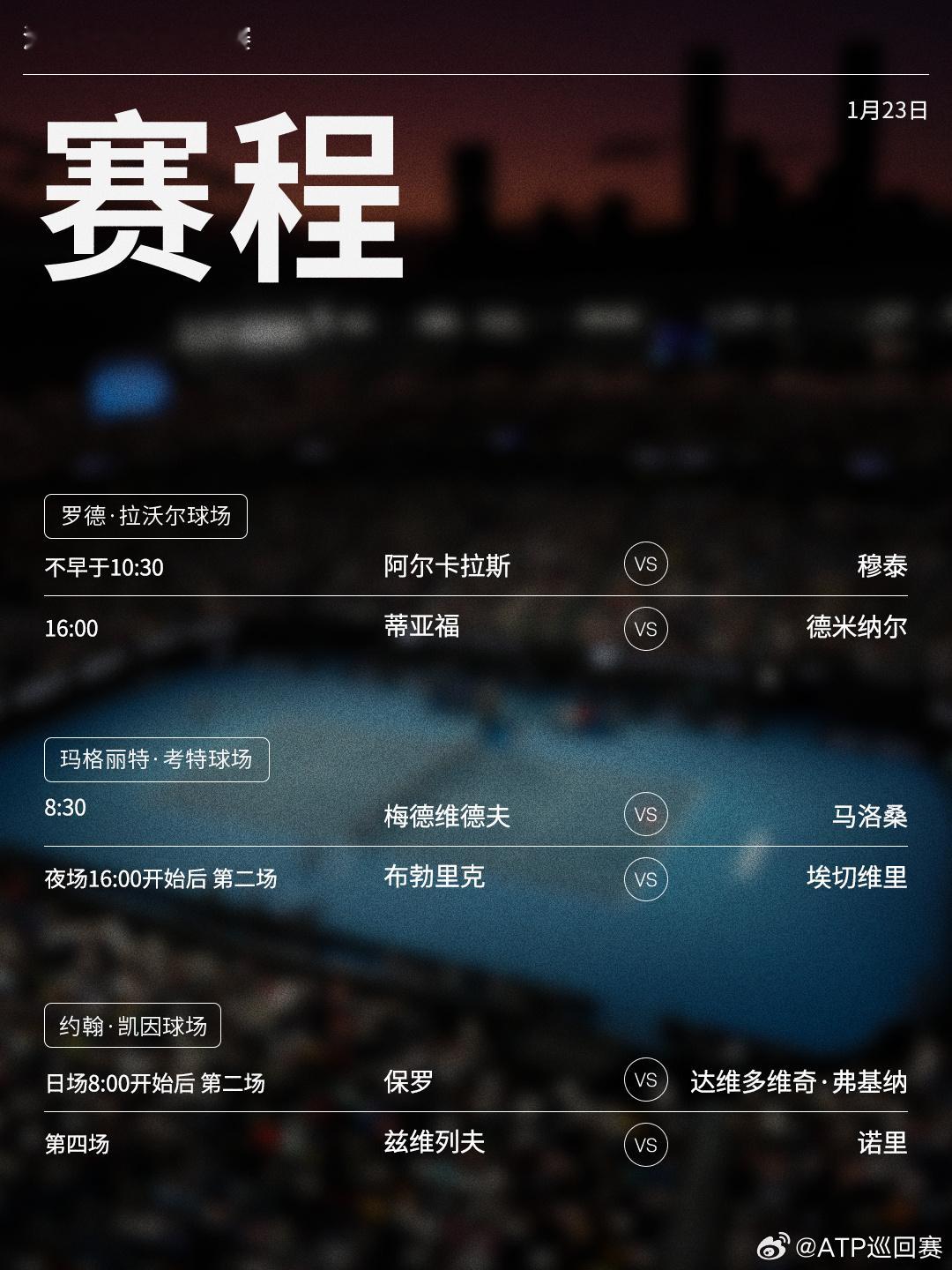 澳网2026 1月23日将展开上半区男单第三轮的争夺,赛程见图(均为北京时间)📅🎾 阿尔卡拉斯、兹维列夫、梅德维德夫冲击16强席位,本土一哥德米纳尔迎战强敌蒂亚福。网来不息ATP