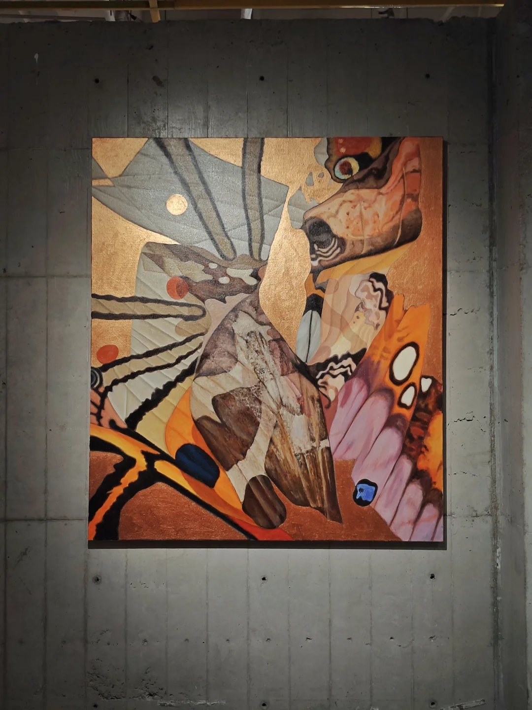 以“拟态”为核心,游走于具象与抽象边界。作品借蝶翼蜕变隐喻环境危机与技术介入,融合赫斯特标本美学与东方式“物哀”情怀。