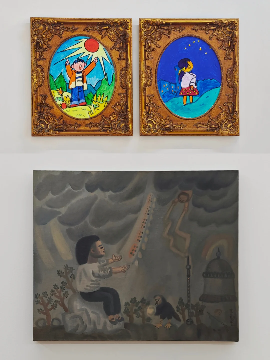 虽是央美油画硕士,作品却无传统学院气,充满民间匠人的拙朴与诚意。融合宗教叙事与日常场景,以质朴笔触和克制色彩弱化宏大叙事的沉重感,擅长将圣经故事转化为乡村等生活化画面,常以山林、岩石或瓦片、门板等现成物为载体,形成“日常即道场”的哲学理念,引发观者对生命本质的思考。