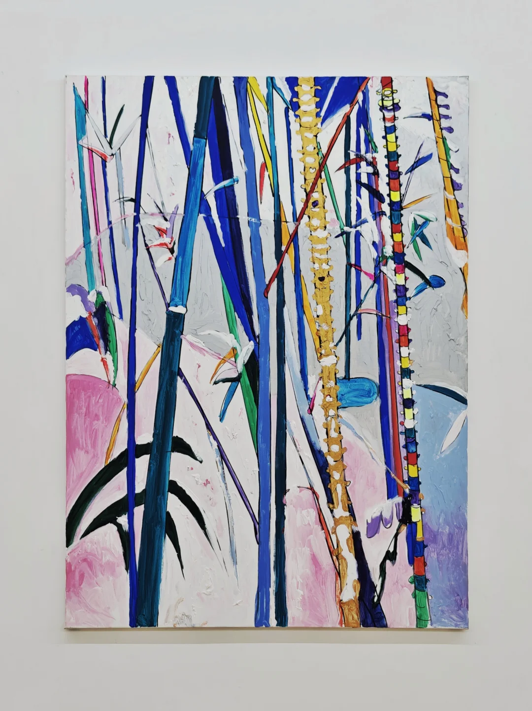 央美壁画系出身,现任教国美。作品以高饱和度色彩、稚拙线条与即兴创作为特征,融合壁画的视觉张力与当代艺术的实验性,受关良戏曲人物画启发,从孙悟空、竹等传统文化符号与怀旧元素中提取灵感,通过扁平化处理和夸张变形构建充满童趣与生命力的画面,主打“艺术疗愈”特质。