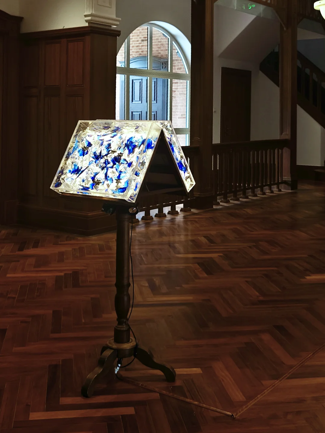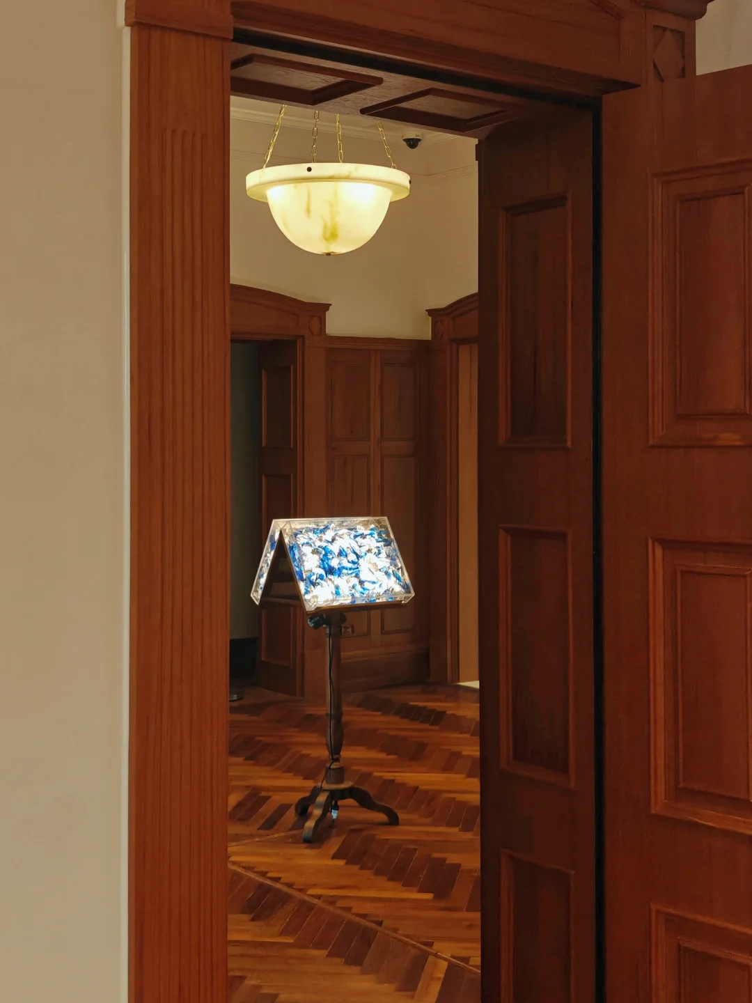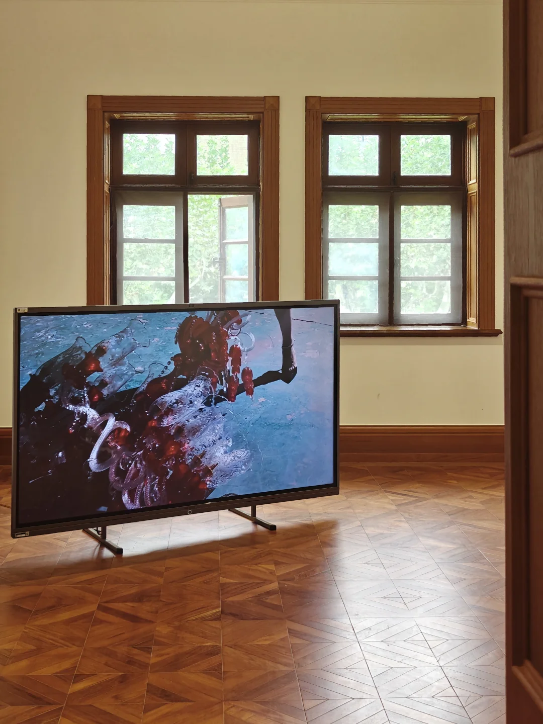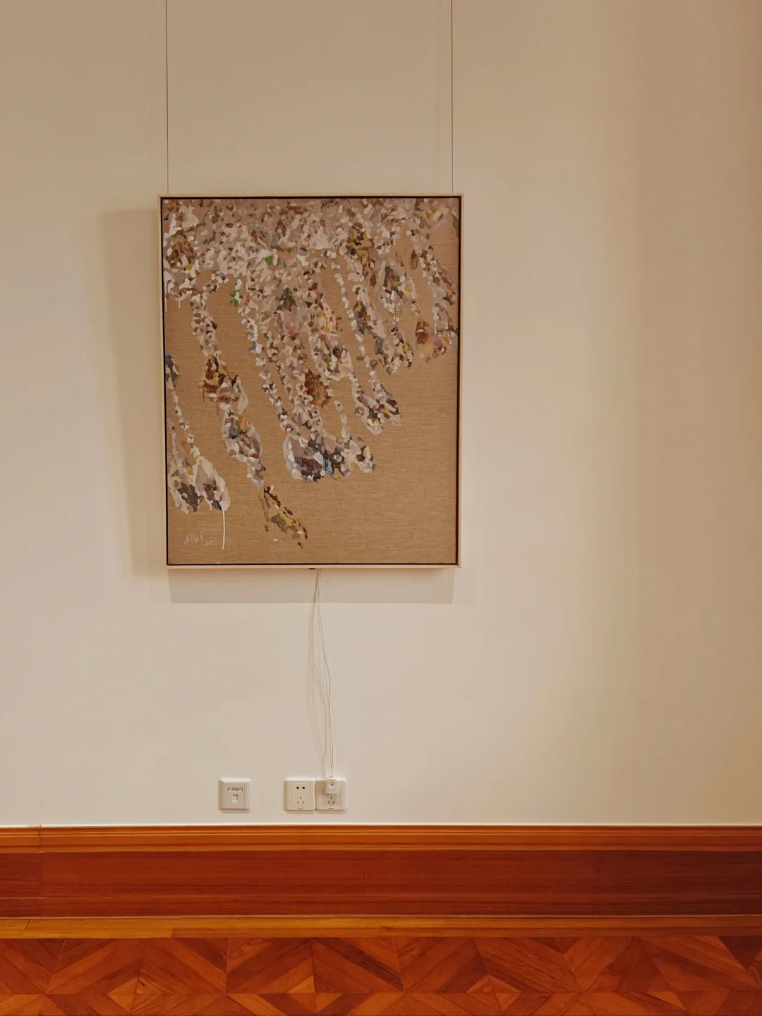 ??她似乎很着迷于水晶灯,代表作《坠美》将水晶灯反复打碎后拼贴重组的艺术装置,搭配了由上音副教授、钢琴家葛灏演奏的德彪西《月光》。一间屋子播放着行为纪录片,她拖曳着巨大的水晶灯走过斑驳仓库,珠片与地面的摩擦凝聚出一种原始的戏剧张力。