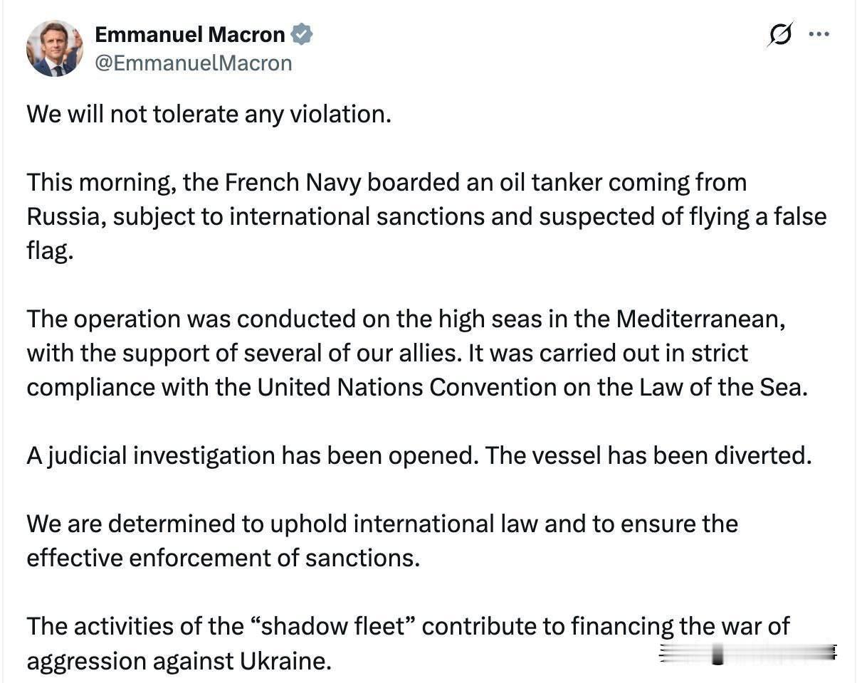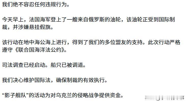 法国总统马克龙宣布,当地时间1月22日早上,法国海军在地中海海域扣押了一艘从俄罗斯驶来的油轮。此次行动得到了多个盟友的协助。 马克龙在发布上述消息后,附上了一张法国海军扣押油轮的照片(图三)。
