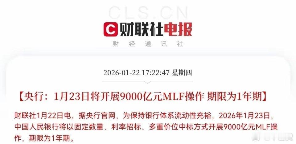 重磅!央行放大招:9000亿MLF驰援,A股流动性预期全面升温盘后突发重磅利好!央行发布公告,为维护银行体系流动性合理充裕,将于2026年1月23日开展9000亿元1年期MLF操作。作为年内第三次逆回购类流动性投放动作,此次操作不仅延续了高频次、大手笔的操作风格,更向市场释放出货币政策坚定呵护流动性、全力稳增长的明确信号,对A股而言堪称系统性利好。其一,稳预期、提信心的作用立竿见影。巨量流动性注入相当于给市场装上“稳定器”,有效对冲当前资金面的季节性压力,极大提振投资者风险偏好与市场信心。其二,引活水、添动能的效果值得期待。市场流动性充裕度提升后,金融机构信贷投放能力增强,投资者持仓底气更足,部分增量资金有望分流至股市,为市场行情注入新动能。此次MLF操作既是对宏观流动性的精准“补水”,也是对市场预期的有效引导,更将进一步降低实体与资本市场的融资成本。在政策红利的加持下,A股市场积极氛围持续升温