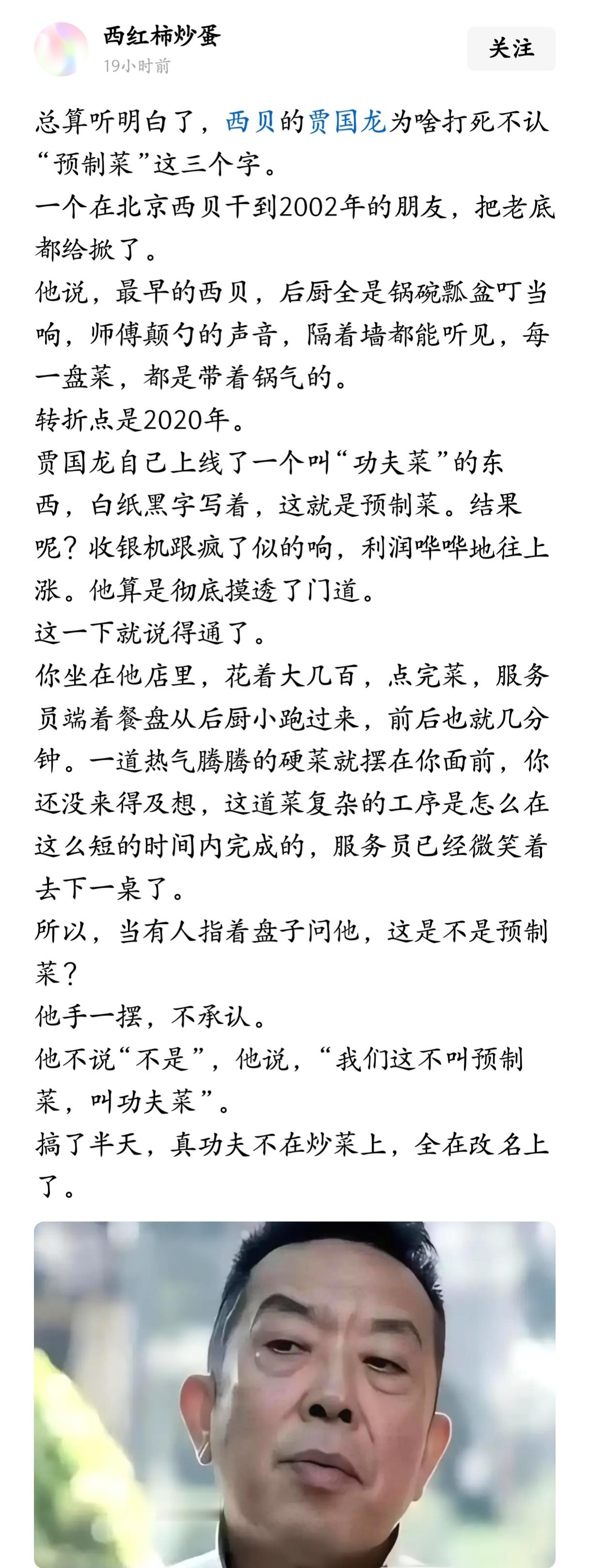 西贝的贾国龙为啥打死不认“预制菜”这三个字?