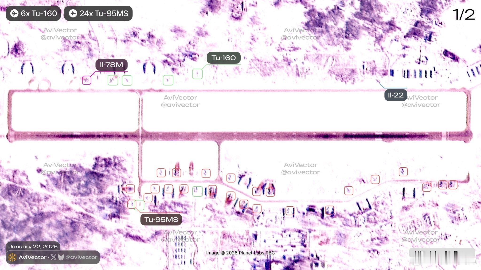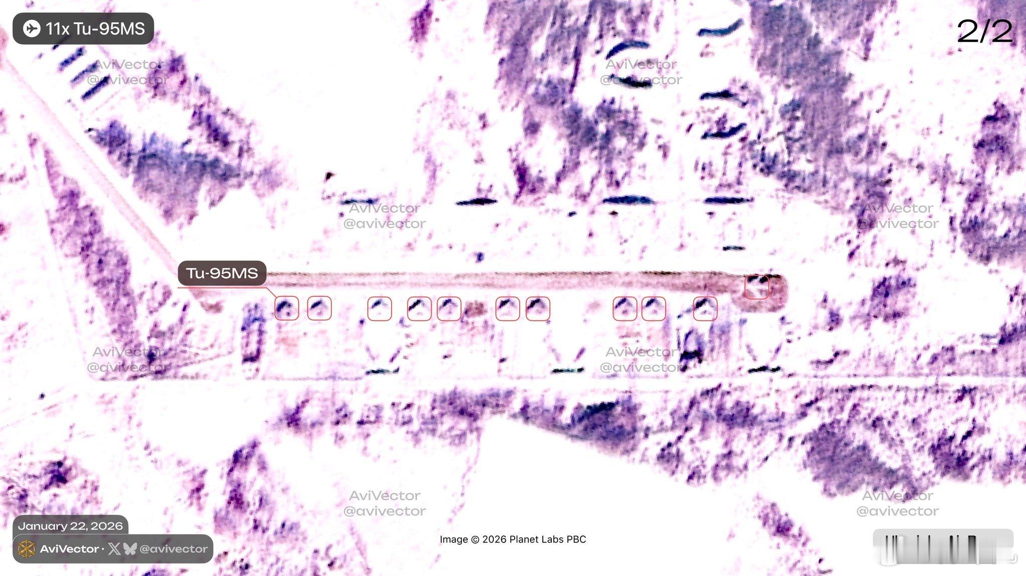 俄罗斯空天军战略航空兵部队在远东地区的乌克兰卡空军基地部署的35架图-95MS战略轰炸机, 6架图-160战略轰炸机, 1架伊尔-78M加油机和1架伊尔-22电子侦察机。