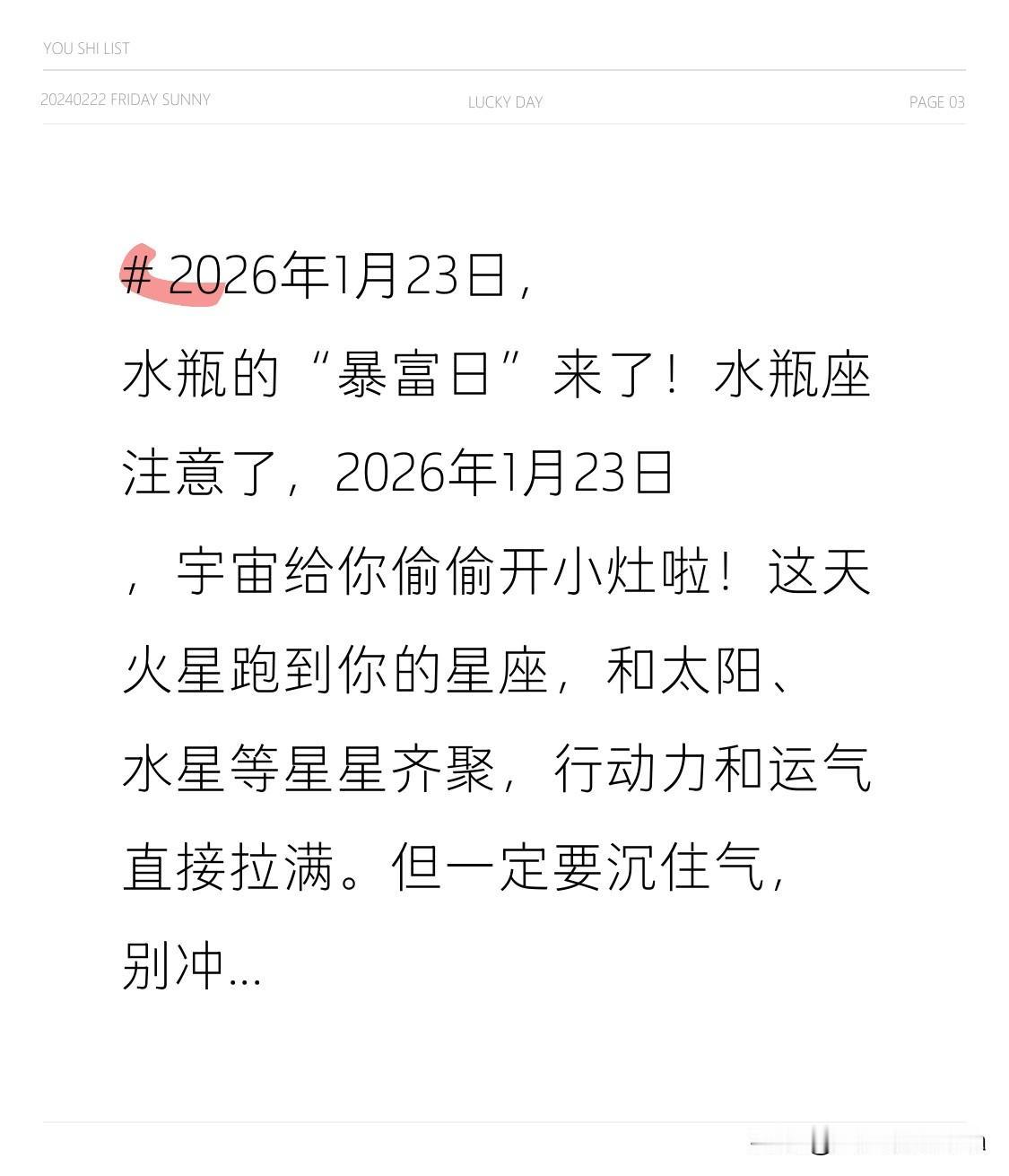 2026年1月23日,水瓶的“暴富日”来了! 水瓶座注意了,2026年1月23日,宇宙给你偷偷开小灶啦!这天火星跑到你的星座,和太阳、水星等星星齐聚,行动力和运气直接拉满。但一定要沉住气,别冲动做决定,因为有笔大收获正朝你飞奔而来。 这收获可能是你一直研究的科技点子被人投资,或是经营已久的社群带来大合作,又或是早前布局的项目开始大规模盈利。这可是对你平时独到眼光和创新思维的奖励。就等你稳稳接住这份好运,开启2026的财富新篇啦!