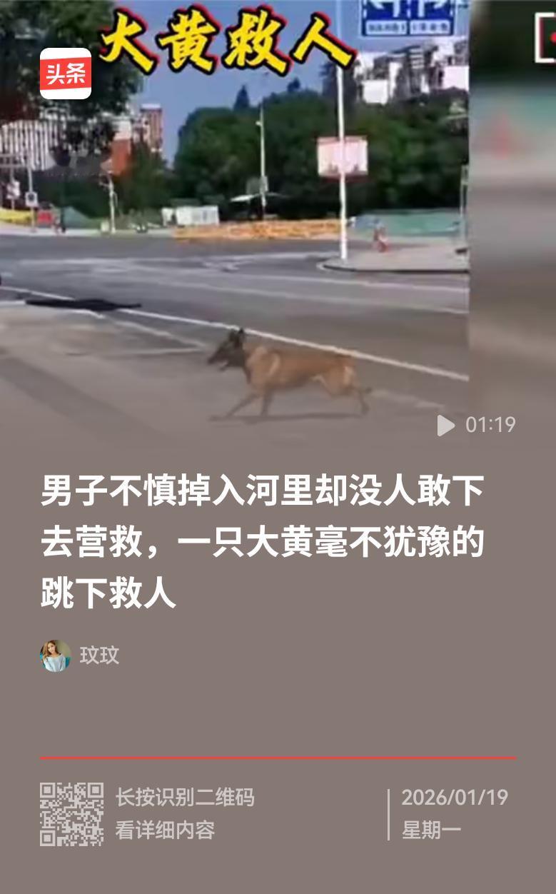 一名男子不慎坠入河中,由于他不通水性,只能在水里胡乱扑腾。眼见他体力渐衰,有溺水的危险,岸上虽有众多人围观,却无人敢下水施救。并非围观者冷漠,而是不敢贸然下水,生怕救人不成,还把自己的性命搭进去。 就在围观者不知所措之际,一只大黄狗听到人们的呼救声,立刻飞奔而来。它爬到桥上往下一看,发现落水男子正在水中挣扎,毫不犹豫地纵身一跃。落水后,它奋力游到男子身旁,从后面咬住男子的衣服,边划水边向岸边游去。在岸边围观群众的协助下,落水男子被成功救上了岸。 这只狗真有灵性,关键时刻比人还勇敢,能救人于危难之中,值得人类善待。