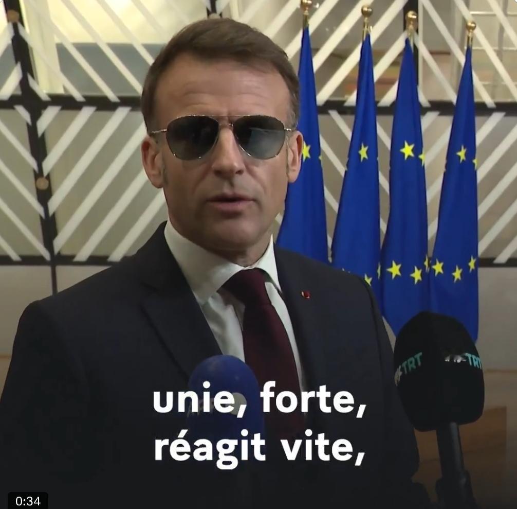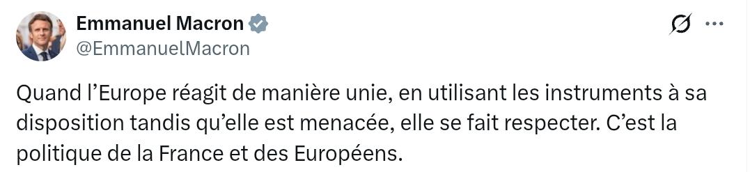 法国总统马克龙:当欧洲在受到威胁时团结一致,运用一切可用手段做出反应,就能赢得尊重。这正是法国和欧洲各国的政策